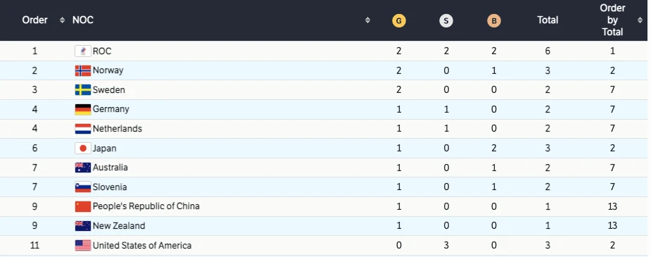 После победы фигуристов Россия вышла в лидеры медального зачета. Россияне выступают под нейтральным флагом (ROC) из-за санкций Всемирного антидопингового агентства.