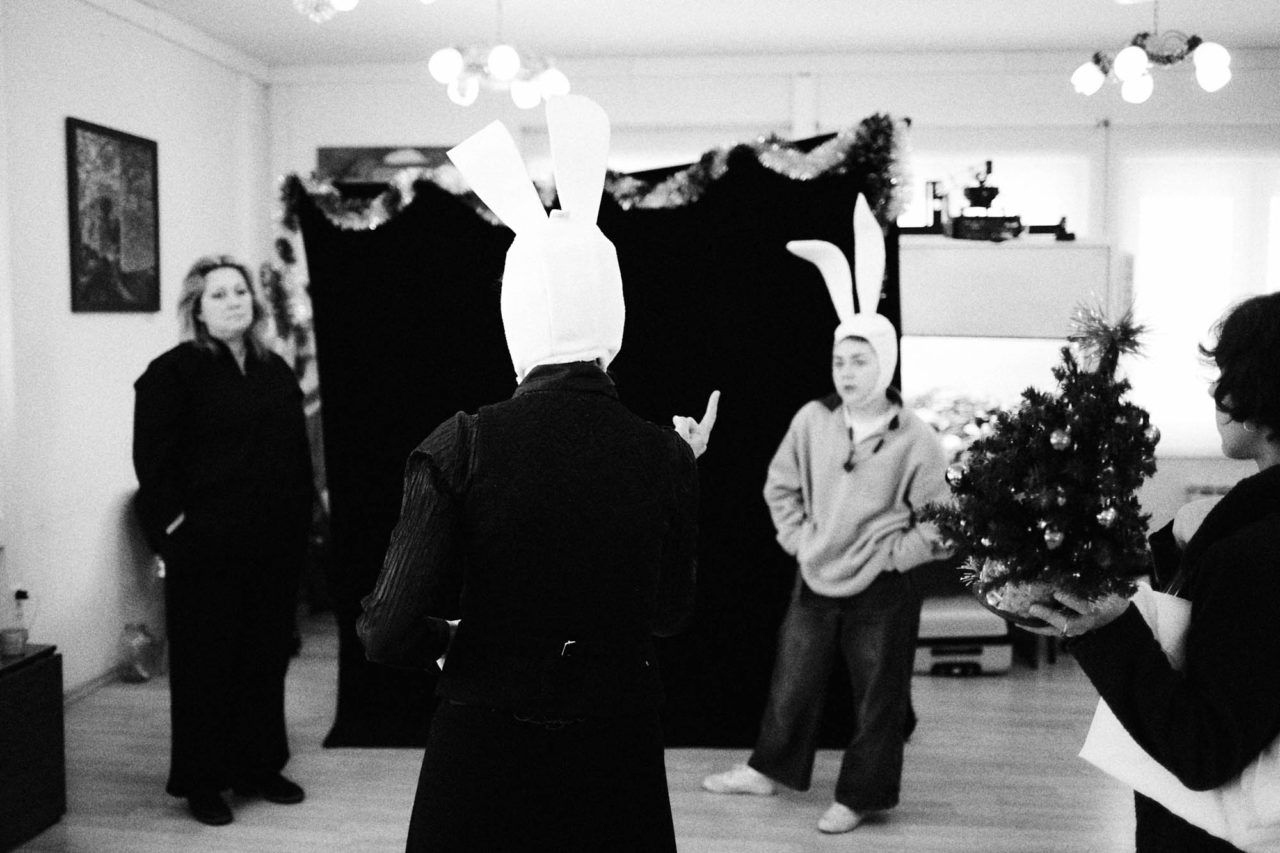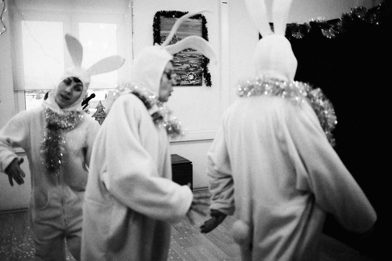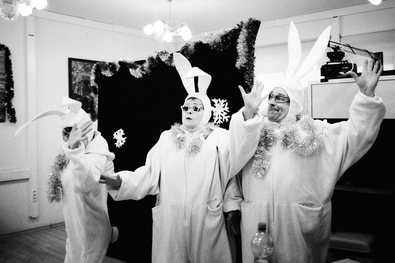 Выступление «Комик-Треста» на новогоднем празднике для сотрудников «Дома надежды на Горе»Фото: Лиза Жакова для ТД В день католического Рождества, месяц спустя после первого посещенного мною концерта, перед реабилитантами высоким голосом поет Ольга Гасилова: «Я буду жить и возвещать дела Господни». Человек с суровым лицом (лысая голова, сломанный нос, тяжелый взгляд) поднимается со своего места в первом ряду и спускается на мороз покурить.