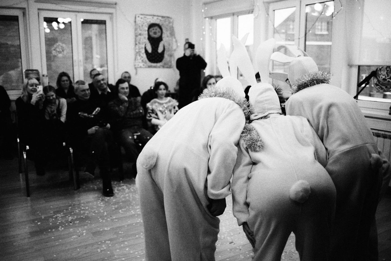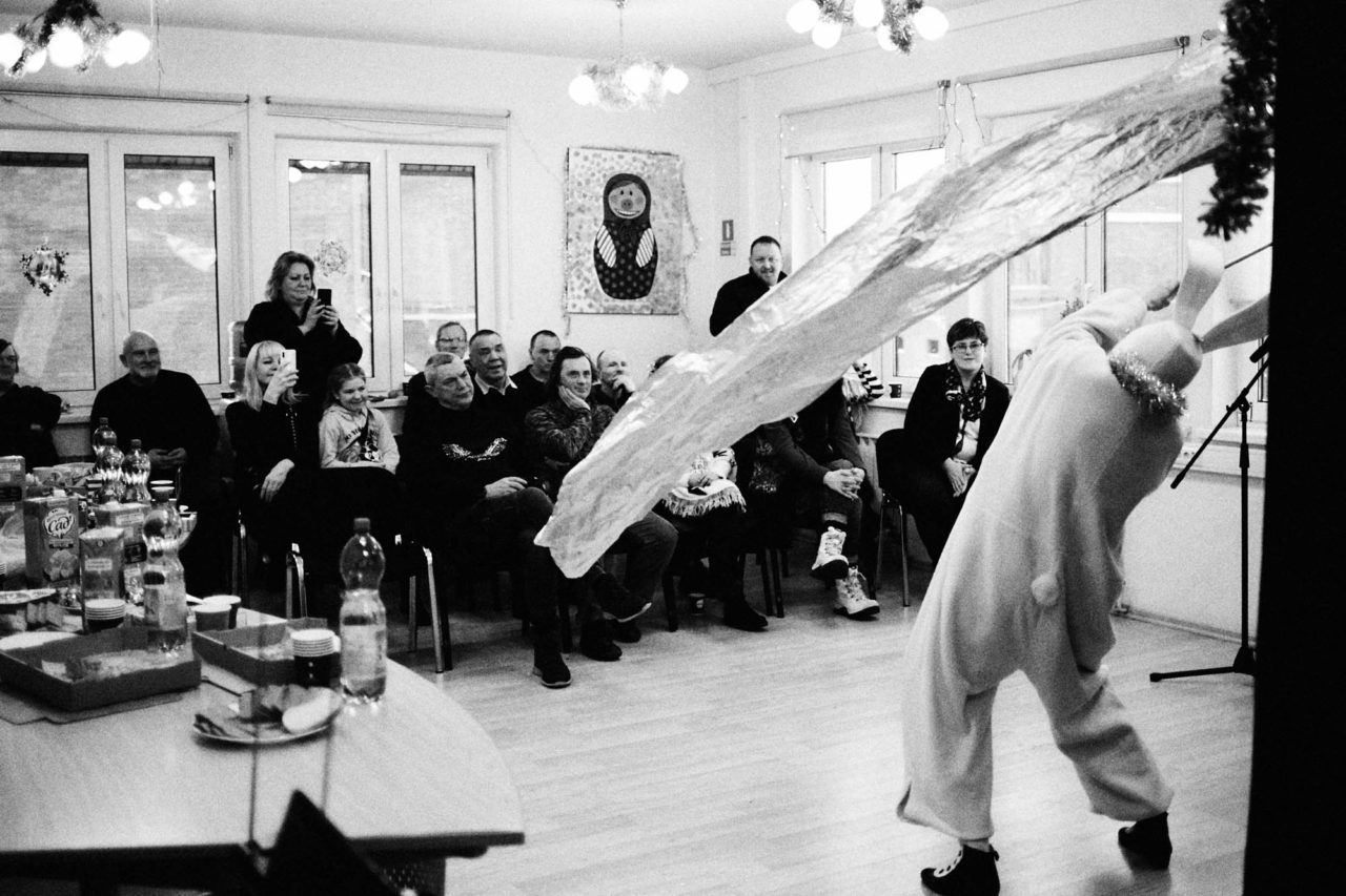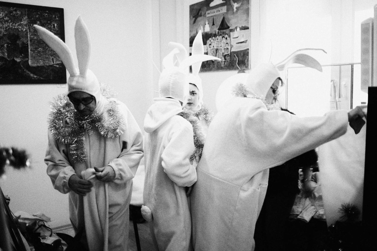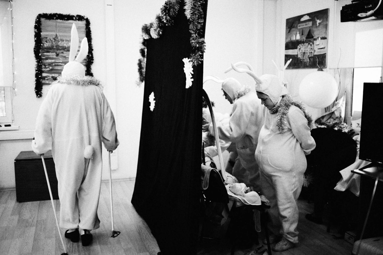 Выступление «Комик-Треста» на новогоднем празднике для сотрудников «Дома надежды на Горе»Фото: Лиза Жакова для ТД В день католического Рождества, месяц спустя после первого посещенного мною концерта, перед реабилитантами высоким голосом поет Ольга Гасилова: «Я буду жить и возвещать дела Господни». Человек с суровым лицом (лысая голова, сломанный нос, тяжелый взгляд) поднимается со своего места в первом ряду и спускается на мороз покурить.
