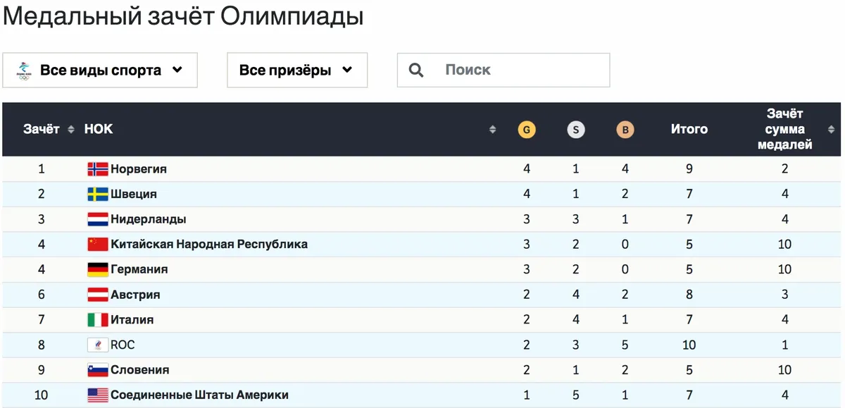Российская команда находится на восьмом месте в медальном зачете. Всего на счету российской сборной две золотые, три серебряных и пять бронзовых медалей. Первые три места медального зачета занимают Норвегия (4-1-4), Швеция (4-1-2) и Нидерланды (3-3-1).