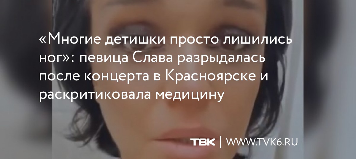 «У нас сегодня был шикарный концерт в Красноярске, но я плачу, потому что очень много сил и здоровья и нервная система… столько всего происходит.Вероятно, случай ребенка, о котором говорила Слава, связан с историей 2019 г., когда в российских больницах перестали выписывать препарат «Винкристин-Тева», необходимый для курса химиотерапии. Препарат заменили на отечественный аналог, который вызывает тяжелые побочные эффекты – у онкобольных детей отнимаются руки и ноги. «ТВК Красноярск»Слава выступила в Красноярске 10 февраля. Видео с речью певицы появилось в официальных TikTok и Instagram.