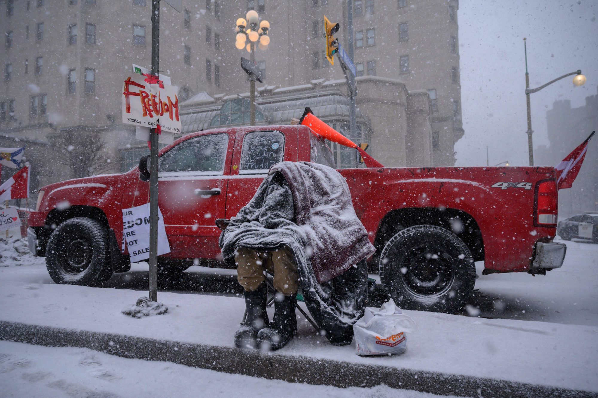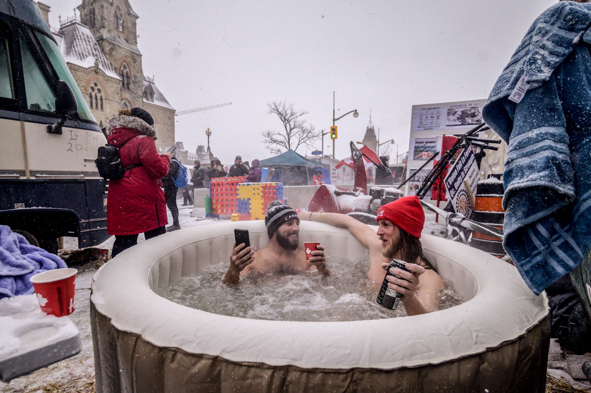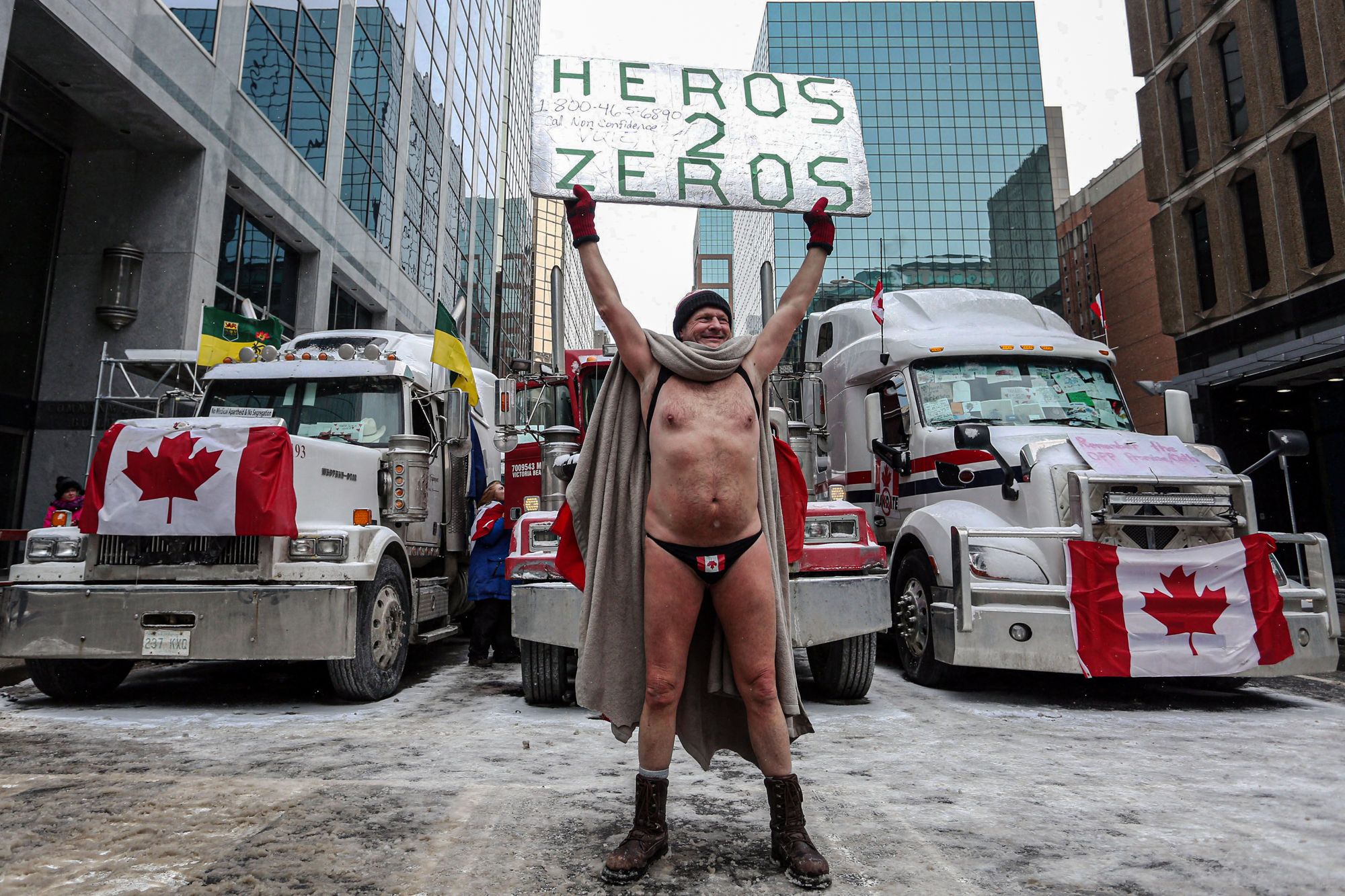 Dave Chan / AFP / Scanpix / LETA Протестующий в Оттаве. Надпись на плакате «Из героев в нули» описывает ситуацию, когда кто-то быстро из популярного и успешного становится неудачником. 12 февраля 2022 года.Spencer Platt / Getty Images Улица в Оттаве, заблокированная машинами протестующих против антиковидных мер и правительства. Участники акции значительно превышают по количеству полицейских. 12 февраля 2022 года.Galit Rodan / Bloomberg / Getty Images Протестующие блокируют проезд по Амбассадору (The Ambassador Bridge) — это подвесной мост длиной 2286 метров через реку Детройт, соединяющий канадский город Уинсор и американский Детройт. От блокады моста уже пострадали автопроизводители: обычно по этому пути перевозятся товары на сумму 300 миллионов долларов в день, примерно треть из них связана с автомобильной промышленностью. Некоторые заводы от Онтарио до Алабамы были вынуждены закрыться. 11 февраля 2022 года.Nathan Denette / The Canadian Press / Getty Images Премьер-министр Канады Джастин Трюдо заявил, что 90% из 120 тысяч канадских дальнобойщиков полностью вакцинированы. А также назвал участников акции маргиналами. Протестующих поддержали далеко не все канадцы. На фото — люди молятся у заблокированного противниками ковидных ограничений моста Амбассадор. 11 февраля 2022 года.Nathan Denette / The Canadian Press / Getty Images Сотрудники полиции, выстроившись в линию, попытались снять блокаду моста Амбассадор, но отогнать им удалось только некоторых протестующих. Несмотря на холод, количество участников акции увеличилось. 13 февраля 2022 года.Nathan Denette / The Canadian Press / Getty Images Полиция задерживает человека у моста Амбассадор. С начала протестов в Канаде возбуждено более 60 уголовных дел из-за хулиганства, краж, повреждения имущества и преступлений на почве ненависти. 13 февраля 2022 года.Andre Pichette / EPA / Scanpix / LETA Протестующие у парламента Канады в центре Оттавы. По оценке местной полиции, 12 февраля в акции приняли участие более четырех тысяч человек.Ed Jones / AFP / Scanpix / LETA Одновременно с акцией дальнобойщиков в интернете начался сбор средств в их поддержку — за несколько дней водителям пожертвовали девять миллионов канадских долларов. Собранные средства идут на оплату гостиничных номеров, топлива и еды для протестующих. На фото — протестующие в надувном бассейне, между грузовиками дальнобойщиков. Оттава, 12 февраля 2022 года.Ed Jones / AFP / Scanpix / LETA Один из протестующих пытается согреться во время снегопада. Полиция Оттавы сообщила, что будет задерживать людей, которые помогают участникам акции, в том числе привозят им топливо, туалетную бумагу и продукты питания. А также конфисковала топливо у водителей. Оттава, 12 февраля 2022 года.