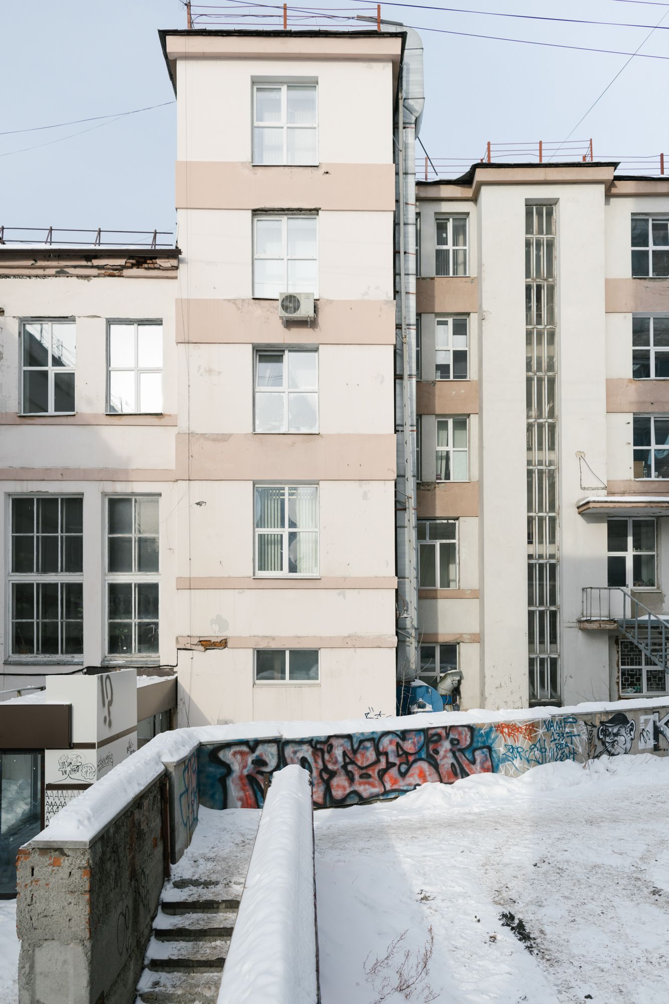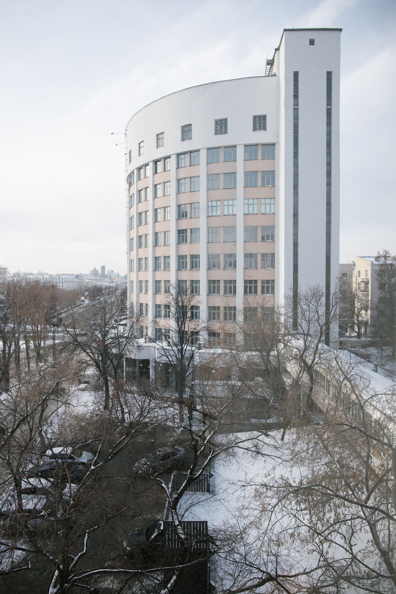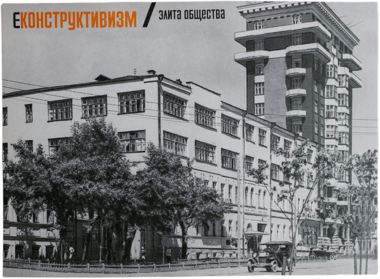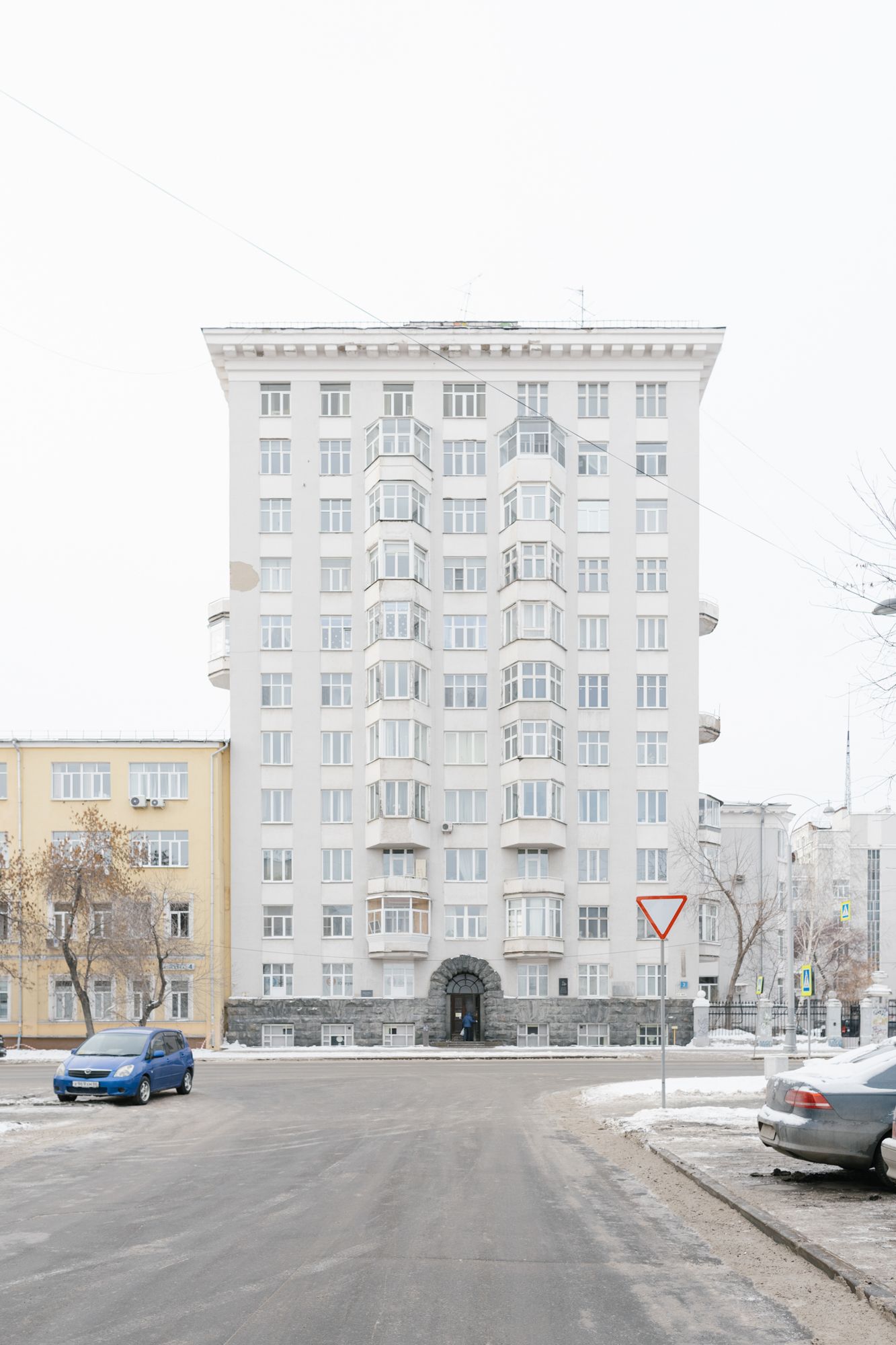 Жилой комбинат № 1, или Второй дом советов, стал единственным в своем роде гибридом уральского авангарда и северного модерна. Цокольный этаж пятиэтажного корпуса и входные порталы облицованы грубым камнем, балконы вторых этажей поддерживают рубленые консоли, закругленные углы с массивной колонной на первом этаже венчают плавные ступенчатые щипцы, эркеры чередуются с балконами.