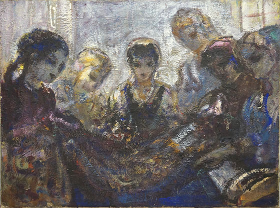 © Собрание А. и Л. Франц В. Калужнин. Ткачихи. 1950-е — 1960-е. Картон, темпера Так и существует Василий Павлович — «только увеличивает тесноту в комнате… свободу в карманах». Иначе говоря, работ все больше, а денег по-прежнему нет. Кто-нибудь затосковал бы от такой жизни, а он строит планы: может, его спасут мурманские заказы? Или проявит великодушие некто Слоневский, с которым должен связаться приятель?
