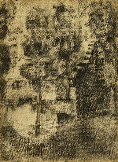 © Собрание семьи Ласкиных В. Калужнин. Деревенский пейзаж. 1920-е — 1930-е. Бумага, уголь Кроме вечного безденежья и близкой слепоты есть текущие сложности. Например, зима. «Был болен (в комнате мороз!). Не выходил». Впрочем, зима закончится, а обстоятельства — как частные, так и общие — вряд ли скоро переменятся.