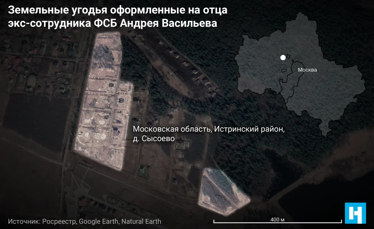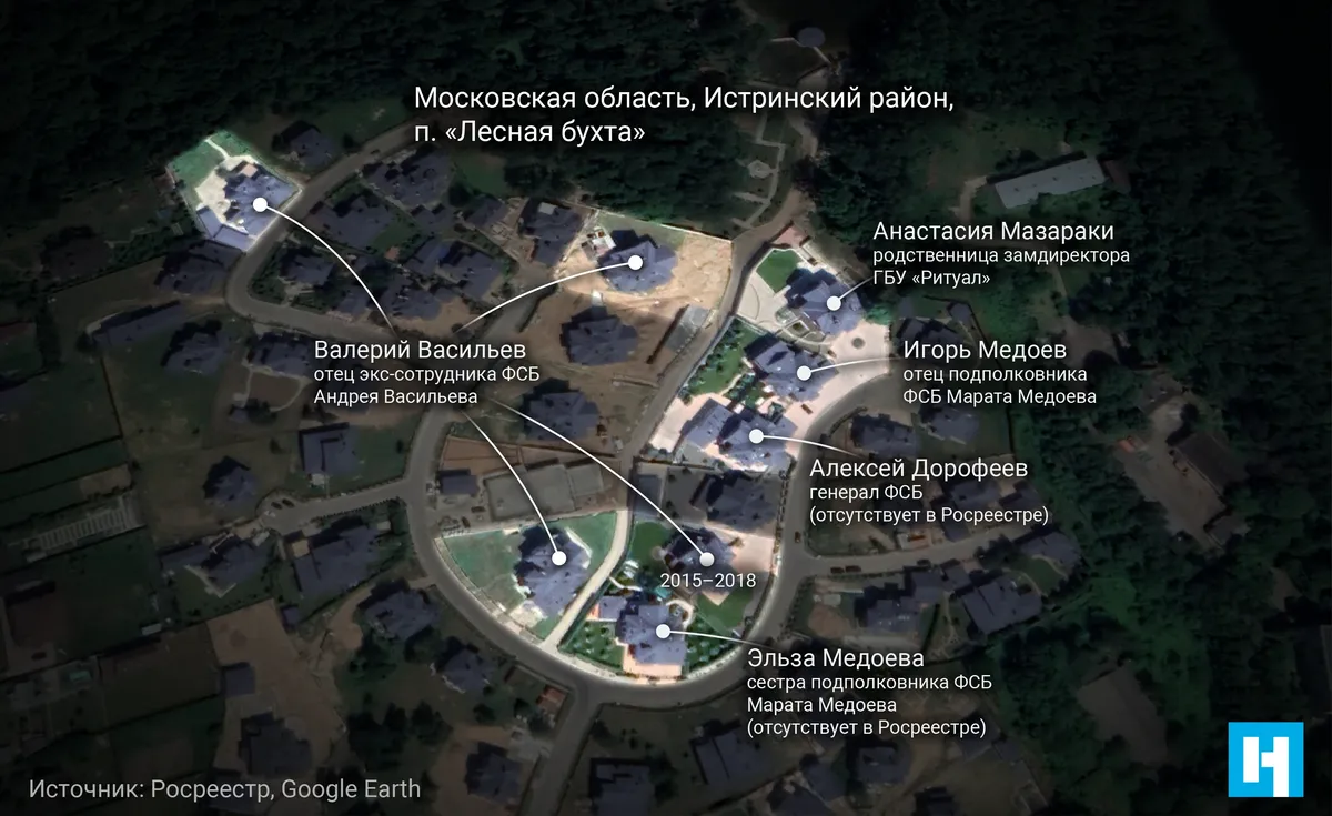 Васильев-старший возглавляет правление дачного некоммерческого партнерства «Сысоево», реорганизованного ныне в товарищество собственников недвижимости «Лесная бухта». Сейчас ему принадлежат три участка со строящимися на них домами, а также два трехэтажных особняка, каждый площадью почти 800 кв. метров и общей кадастровой стоимостью более 28 млн рублей. Соседний с Васильевым участок с особняком, как писала «Новая» еще в 2019 году, принадлежал сестре подполковника ФСБ Марата Медоева Эльзе Медоевой. Еще один дом в поселке, по данным Росреестра, принадлежит отцу этого силовика Игорю Медоеву, при этом его имя в документах не скрыто.В 2018 году имя Эльзы Медоевой в выписке о праве собственности изменилось на условное обозначение «Российская Федерация». (Так с недавних пор обозначают владельцев недвижимости, являющихся государственными служащими высшей категории.) А сейчас данные об этом участке вовсе исчезли из Росреестра, земля теперь определяется как часть кадастрового квартала, куда входят несколько сотен участков. Еще один соседний участок с домом, принадлежавший генералу ФСБ Алексею Дорофееву, также исчез из базы данных Росреестра. «Российской Федерацией» стали еще несколько владельцев расположенных там же участков. Например, соседним с Медоевым и Васильевым особняком владела супруга брата замдиректора ГБУ «Ритуал» Валериана Мазараки — Анастасия Мазараки. Сейчас, согласно выписке из Росреестра, этот дом также принадлежит «Российской Федерации». Еще два участка, расположенных там же, в начале 2021 года тоже сменили владельца на «Российскую Федерацию» — до этого ими владели некие Наталья Старцева и Роман Малинин.