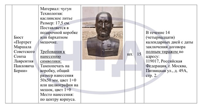 Согласно документации с сайта госзакупок, бюсты главы НКВД заказаны в качестве сувениров. Производитель должен поставить бюсты размером в 17,5 сантиметров в подарочных коробках или бархатных мешочках.