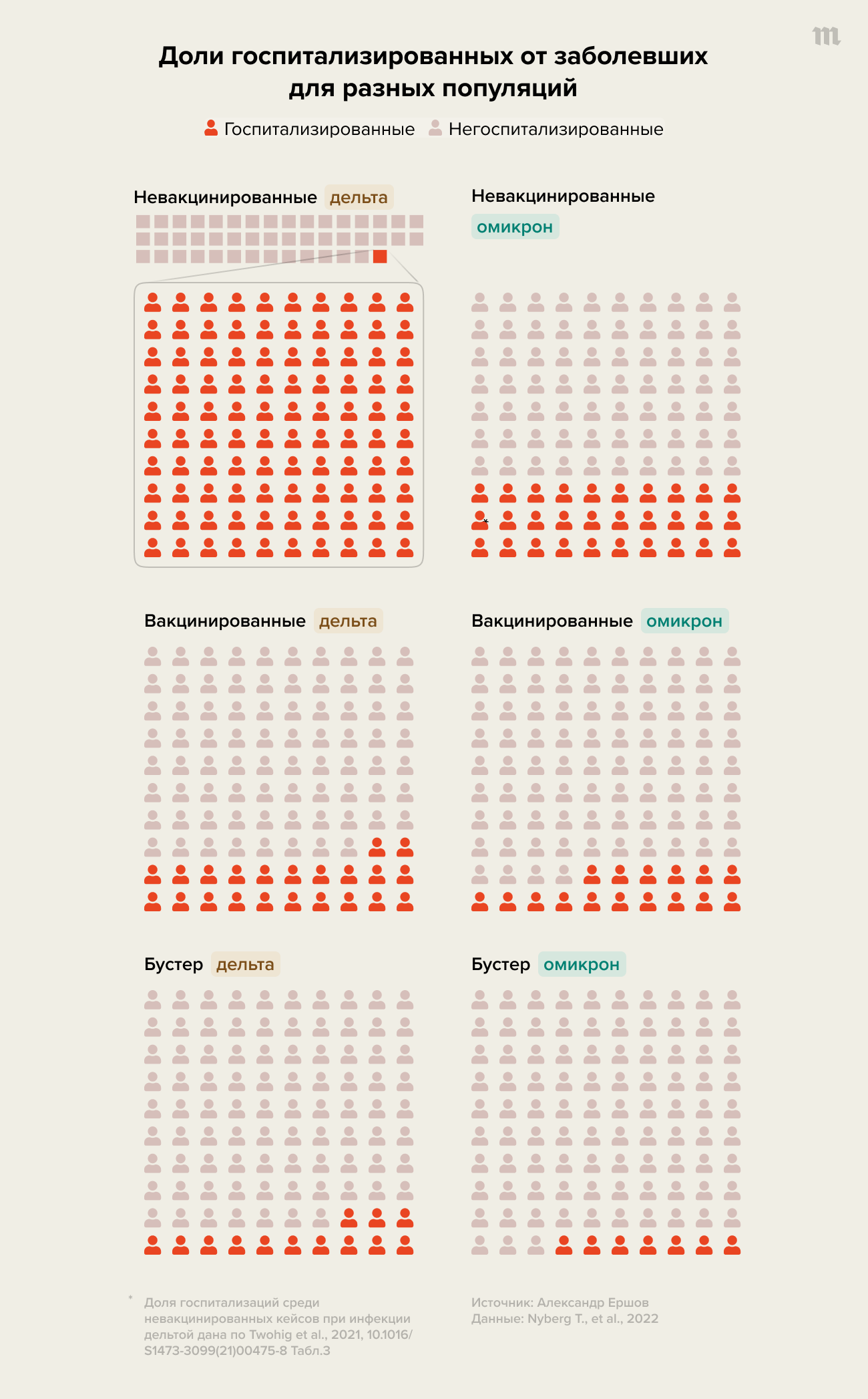 Если из ранее не болевших людей, которые не сделали прививку, в больницу при заражении попадут 100 человек (как в самом первом примере с дельтой), то среди переболевших и заразившихся снова таких будет 55.
