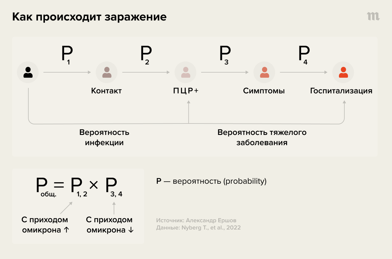 Однако совокупный риск тяжело заболеть и попасть в больницу с приходом омикрона стал не ниже, а выше, чем раньше, — из-за многократно выросшего первого множителя этого простого уравнения, то есть повышенного риска заразиться.