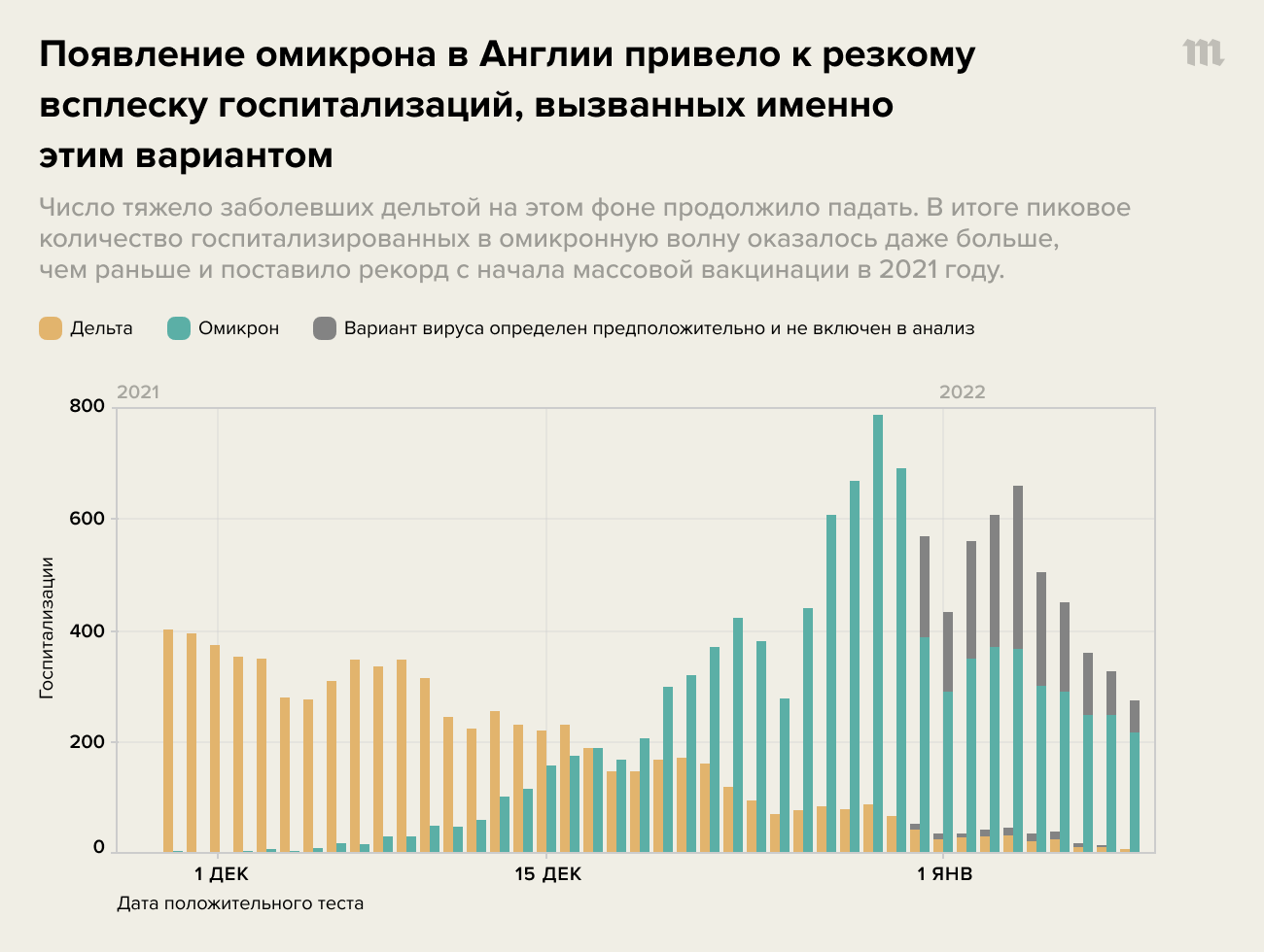 Если, например, посмотреть на статистику заболеваемости, где отдельно показаны заразившиеся дельтой и омикроном (по Великобритании ее приводит команда Фергюсона), хорошо видно, что заболеваемость дельтой в конце 2021 года медленно падала по мере сжатия доли неиммунных в популяции. При этом в той же популяции, среди тех же людей (и с тем же уровнем сдерживающих мер, масками и т. д.) заболеваемость омикроном резко пошла наверх.