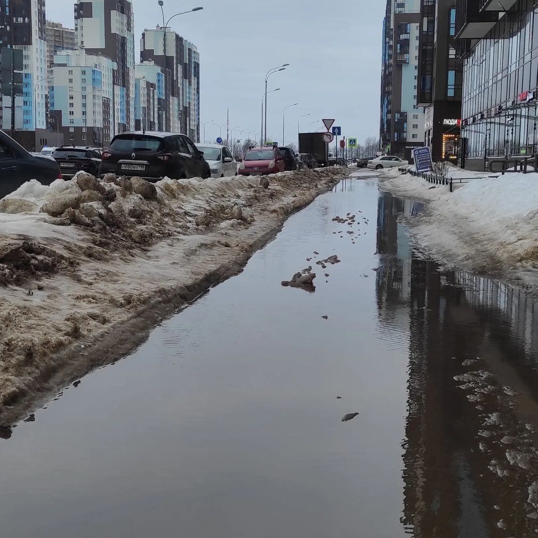 И под конец — немного киберпанка. В Мурине робот-доставщик проезжает по затопленному тротуару мимо мужчины, долбящего наледь топориком.