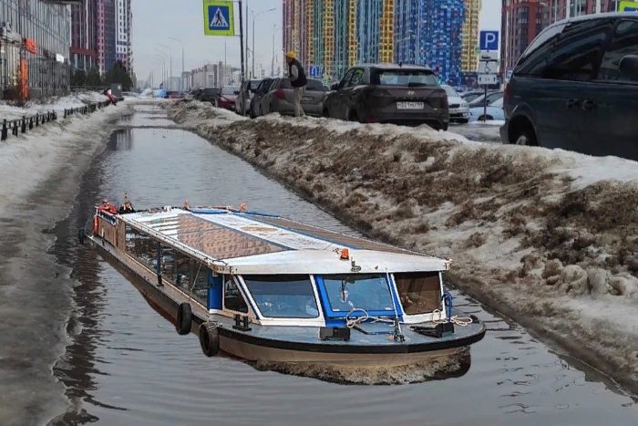 Такая же ситуация на Комендантском проспекте. Местные жители поиронизировали над снимками, добавив на один из них прогулочный кораблик: открыт сезон водных экскурсий по Комендантскому каналу.