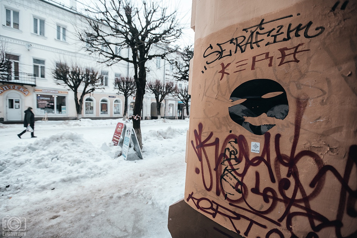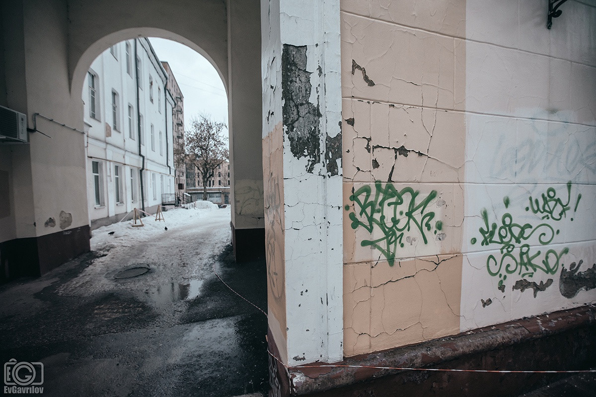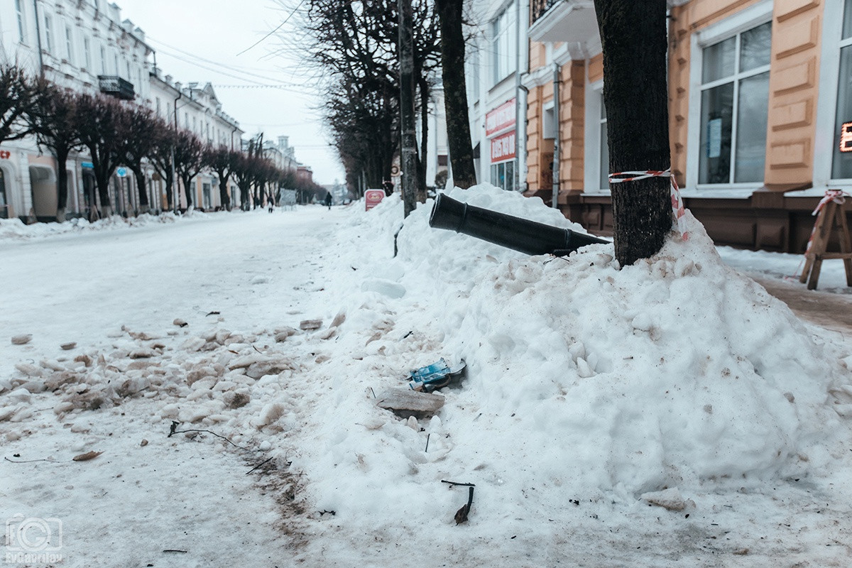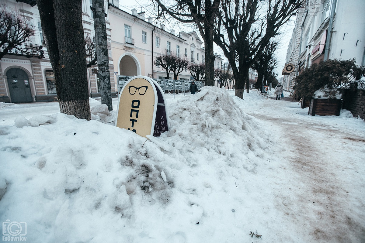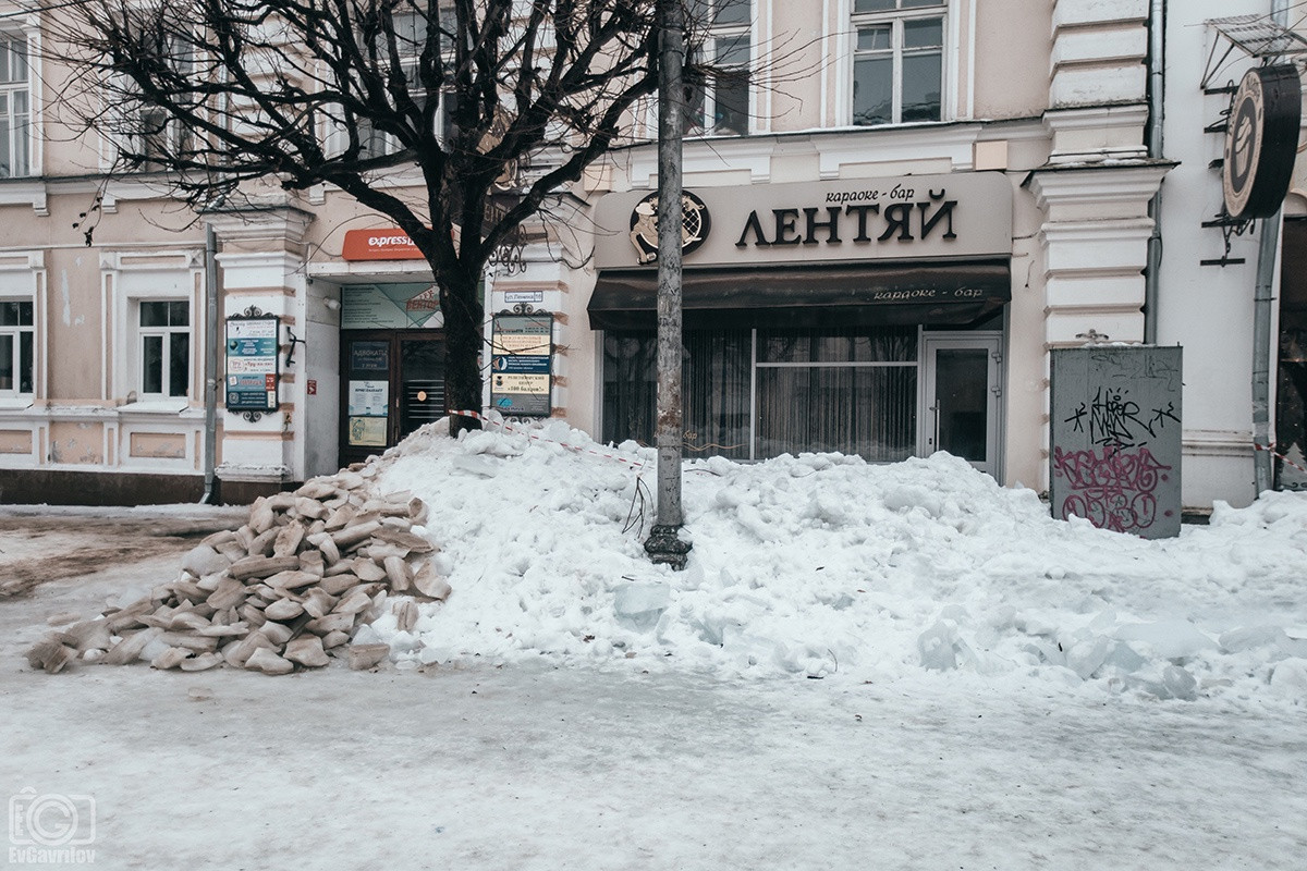 Заброшенные, закрытые магазины, входы в которые завалены мусором. Изрисованные граффити стены, на которые не обращают внимания власти, вмороженные в водосточные трубы глыбы льда, взрывающие свежеуложенную плитку, горы грязного снега и осколки сосулек, которыми забросали даже памятник - пушки у Исторического музея.