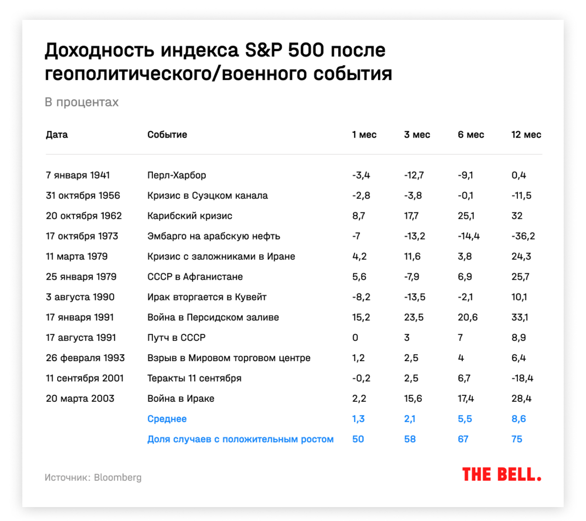 - В месяц после самого серьезного обострения холодной войны между СССР и США — Карибского кризиса 1962 года — S&P 500 вырос на 8,7%. Причина в том, что конфликт вокруг размещенных на «непотопляемом авианосце» Кубы советских ракет, грозивший ядерной войной сверхдержав, тогда разрешился на удивление быстро. В западной историографии принято считать это чистой победой США и унижением СССР. Современные ревизии обращают больше внимания на торг Никиты Хрущева с Джоном Кеннеди и секретное соглашение о выводе американских ракет из Турции и Италии — как и на то, что США сильно недооценили серьезность восприятия американской угрозы руководством СССР.