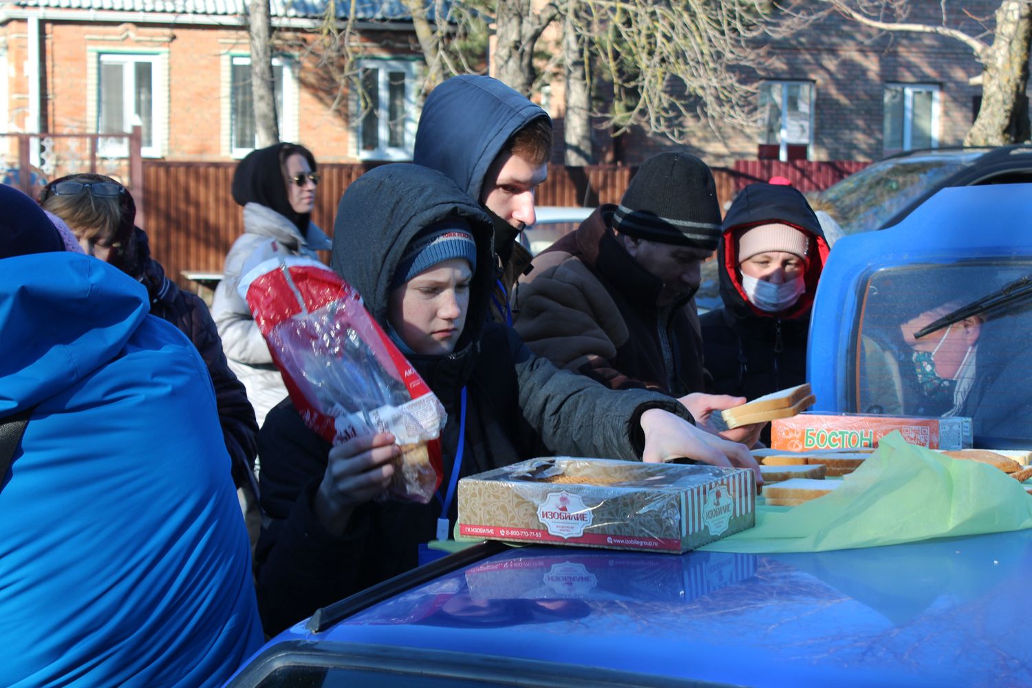 Возле машин выстраиваются очереди. Тут же у забора стоит синяя «Ока» с едой; люди пытаются дотянуться до хлеба и печенья.