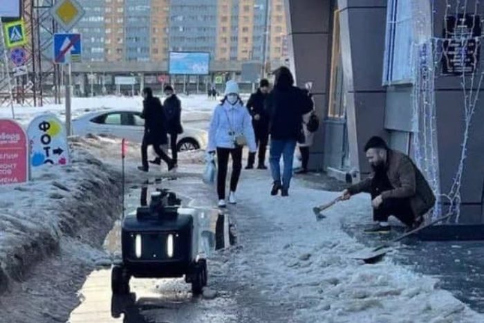 Из-за оттепели в Петербурге образовались многочисленные лужи, которые мешают ходить по улицам. Горожане продолжают шутить на эту тему. Вот, например, дополненная картинка из Мурина, на которой робот-доставщик проезжает по затопленному тротуару мимо мужчины, избавляющегося от наледи топором.