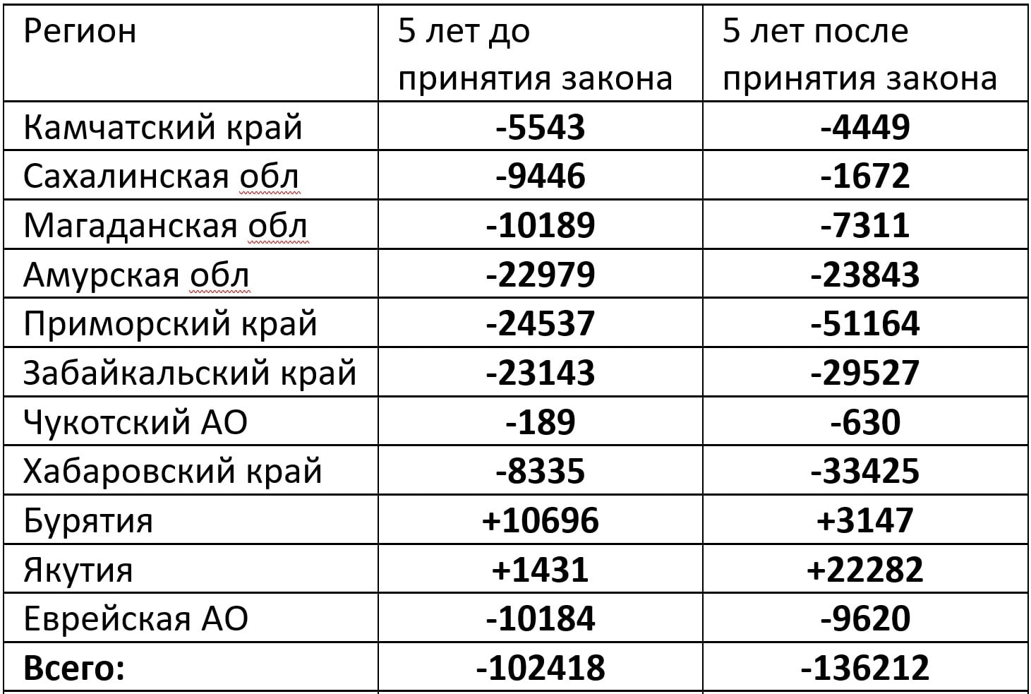 И выясняется, что численность населения ДФО за 5 лет, предшествовавших гениальному закону, сократилась на 102 тысячи человек. А за 5 лет после принятия закона – на 136 тысяч. Сокращение ускорилось.