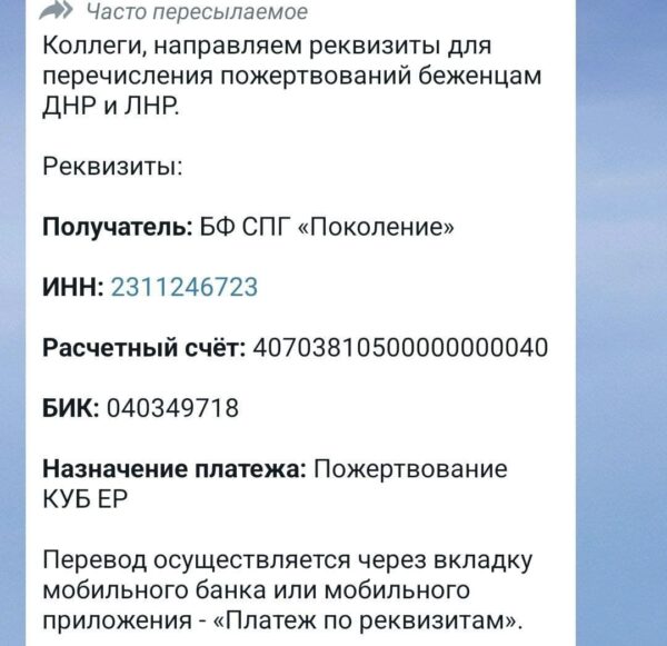 Получателем средств значится краснодарский благотворительный фонд социальной поддержки граждан «Поколение», а в назначении платежа требуется указать «Пожертвование КУБ ЕР».