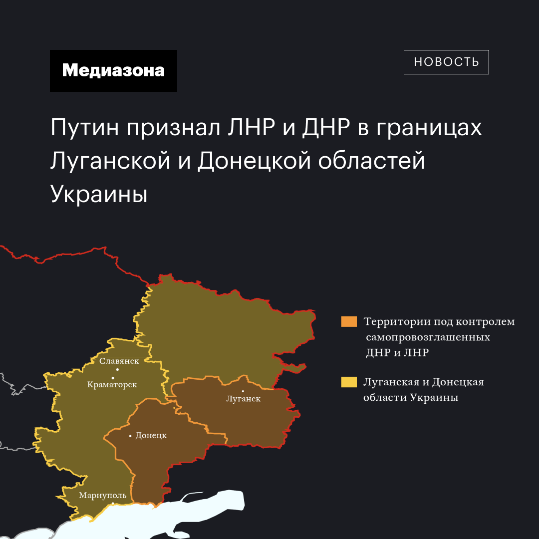 Президент Владимир Путин сказал во время пресс-конференции, что Россия признала самопровозглащенные ДНР и ЛНР в границах Донецкой и Луганской областей Украины.