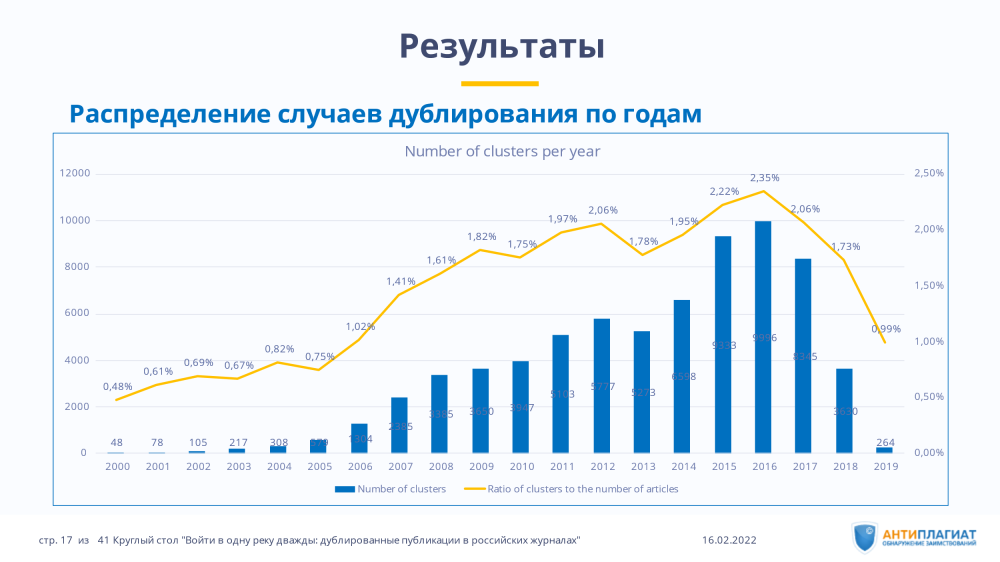 Исследование получилось беспрецедентным, аналогов ему в мире пока нет. Но не потому, что в мире нет недобросовестного дублирования статей или недобросовестных авторов. Уникальность исследования обусловлена особенностями базы НЭБ, для которой длительное время был характерен низкий уровень требований на входе — туда выгружались российские научные журналы самого разного уровня. Так что пока нельзя достоверно сказать, лучше или хуже отечественная ситуация по параметру количества дублирующих публикаций относительно других стран. Да, еще один ключевой момент: западные исследования обычно сравнивают дубли по библиографии, а в настоящем исследовании сравнение шло по текстам статей.