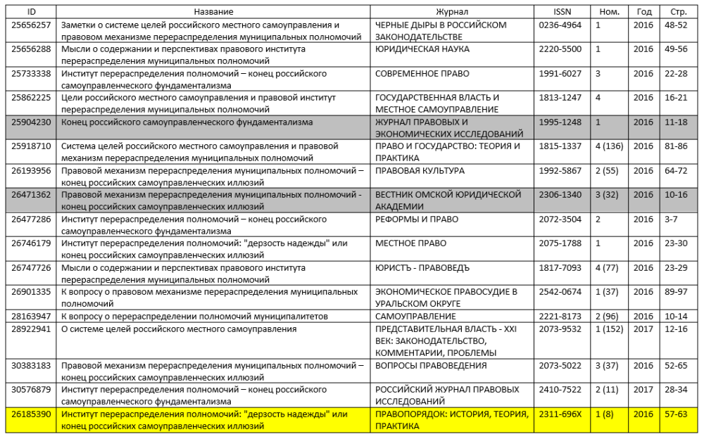 И еще один кейс. Шестнадцать статей со средним пересечением текста 89,43%. У всех статей один автор — С. Г. Соловьев, они опубликованы в разных журналах, две из них вышли в 2017 году, остальные — в 2016 году (рис. 3).