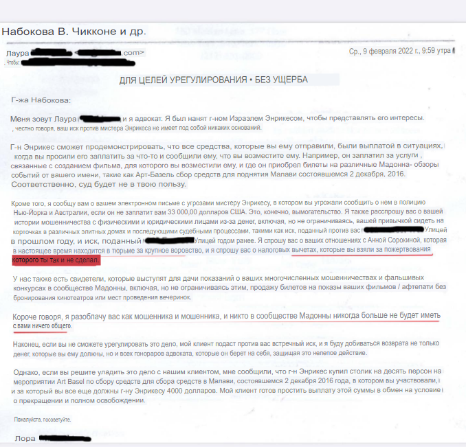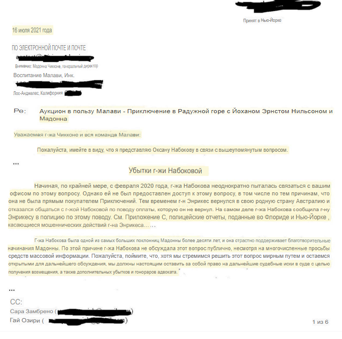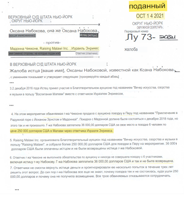 Благотворительный аукцион организовывала организация Raising Malawi Inc. Оксана решила привлечь к ответственности и эту компанию, и посредника, и саму Мадонну. Однако пока это не удалось: в документах указано, что Израэль Энрикес уехал в другую страну, а Мадонна ответила на письмо женщины лишь спустя два года.Судя по документам, Оксана купила путешествие не напрямую у Мадонны, а через посредника – некого Израэля Энрикеса. Именно он, говорится в выписке, отказался возмещать ущерб Набоковой: деньги за несостоявшуюся поездку вернули ему, а не Оксане. Кроме того, он якобы начал называть Набокову мошенницей и угрожать ей.