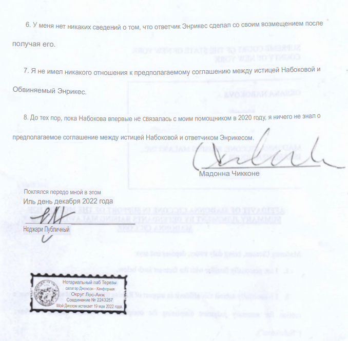 Оксана написала, что долго молчала об этой ситуации из уважения к артистке, но, по всей видимости, теперь она намерена придать ее огласке.«У меня нет никаких сведений о том, что ответчик Энрикес сделал со своим возмещением после его получения. Я не имела никакого отношения к предполагаемому соглашению между истцом Набоковой и ответчиком Энрикесом», – пишет Мадонна (внизу стоит подпись певицы).