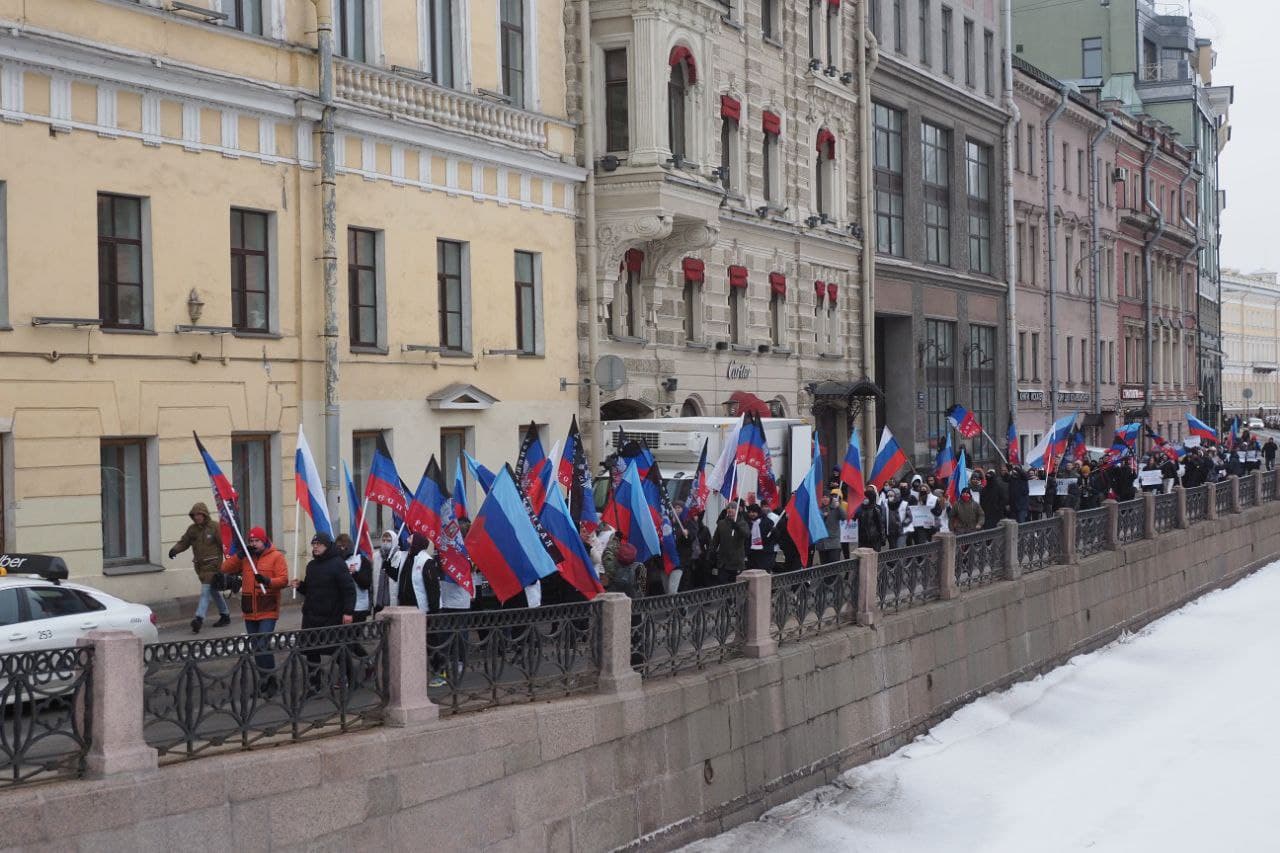 На Дворцовой площади утром 23 февраля прошла акция в поддержку Донбасса. Несколько сотен людей выстроились в фразу «Своих не бросаем» и после этого прошлись с шествием по набережной Мойки и Невскому проспекту.