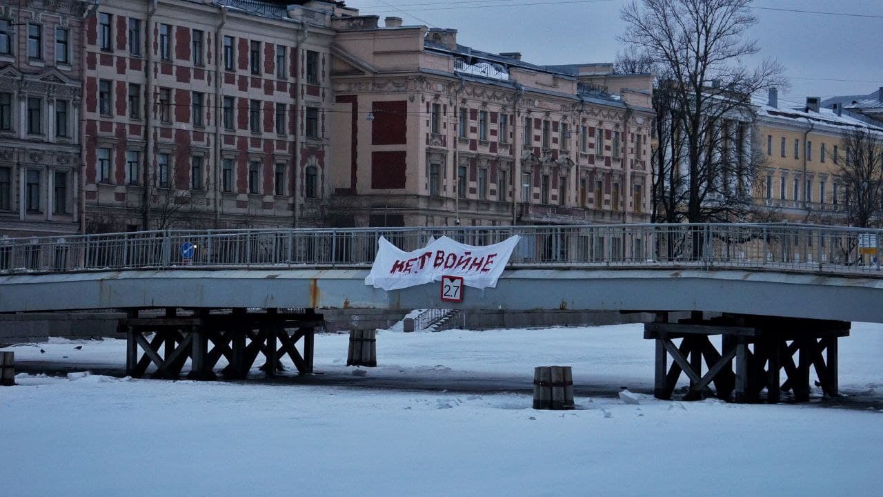 На Горсткином мосту в Адмиралтейском районе Петербурга заметили баннер с надписью «Нет войне». Буквы на нем имитируют кровь.