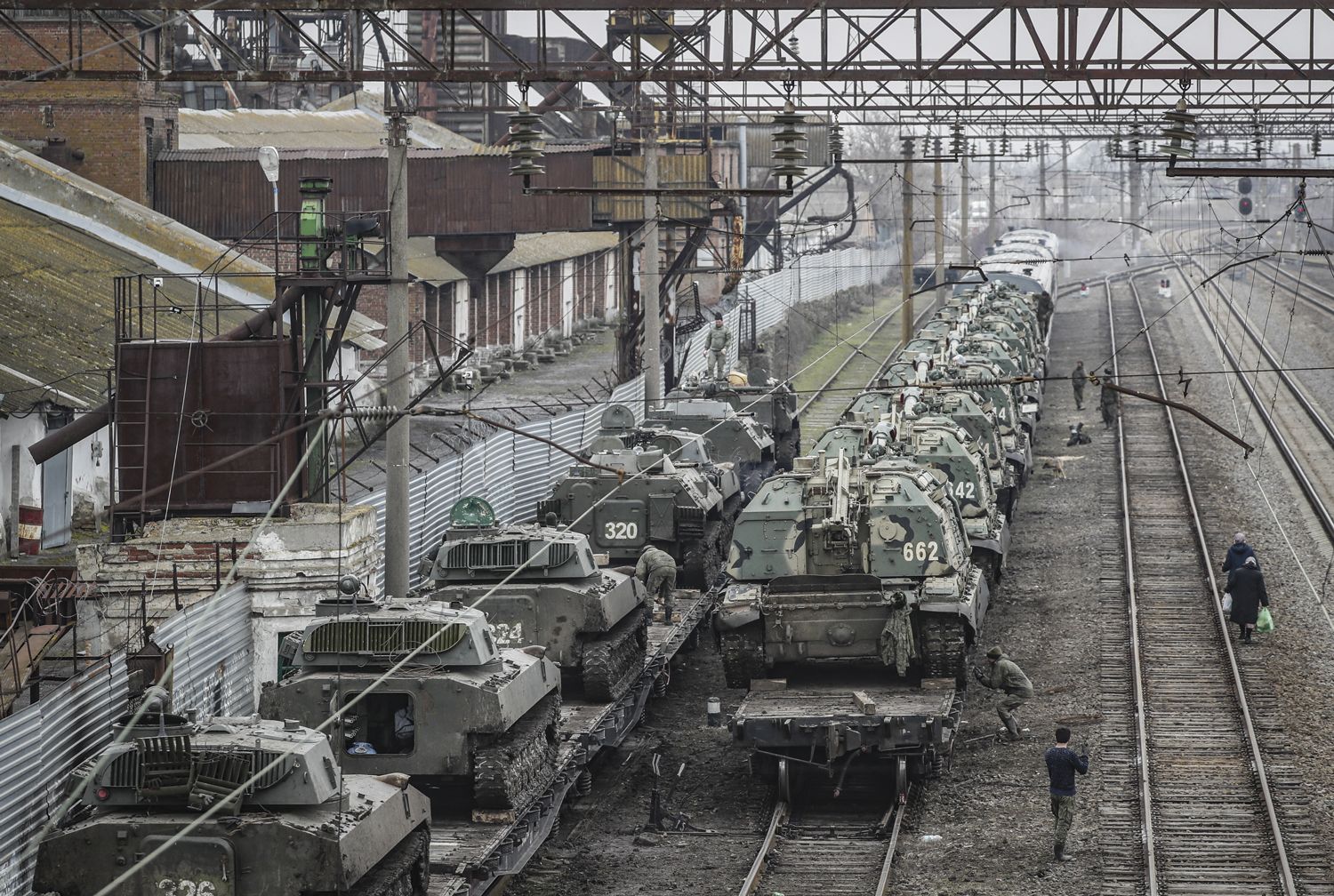EPA / Scanpix / LETA Российская бронетехника на железнодорожной станции в Ростовской области, 23 февраля 2022 года