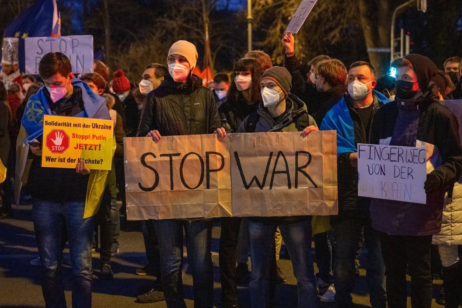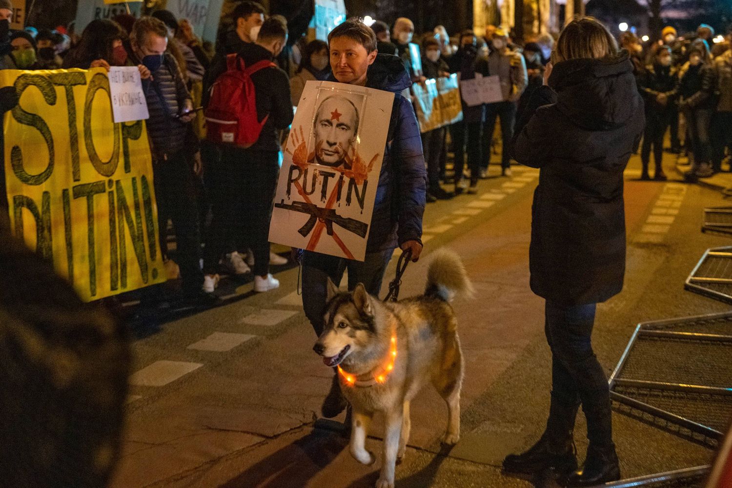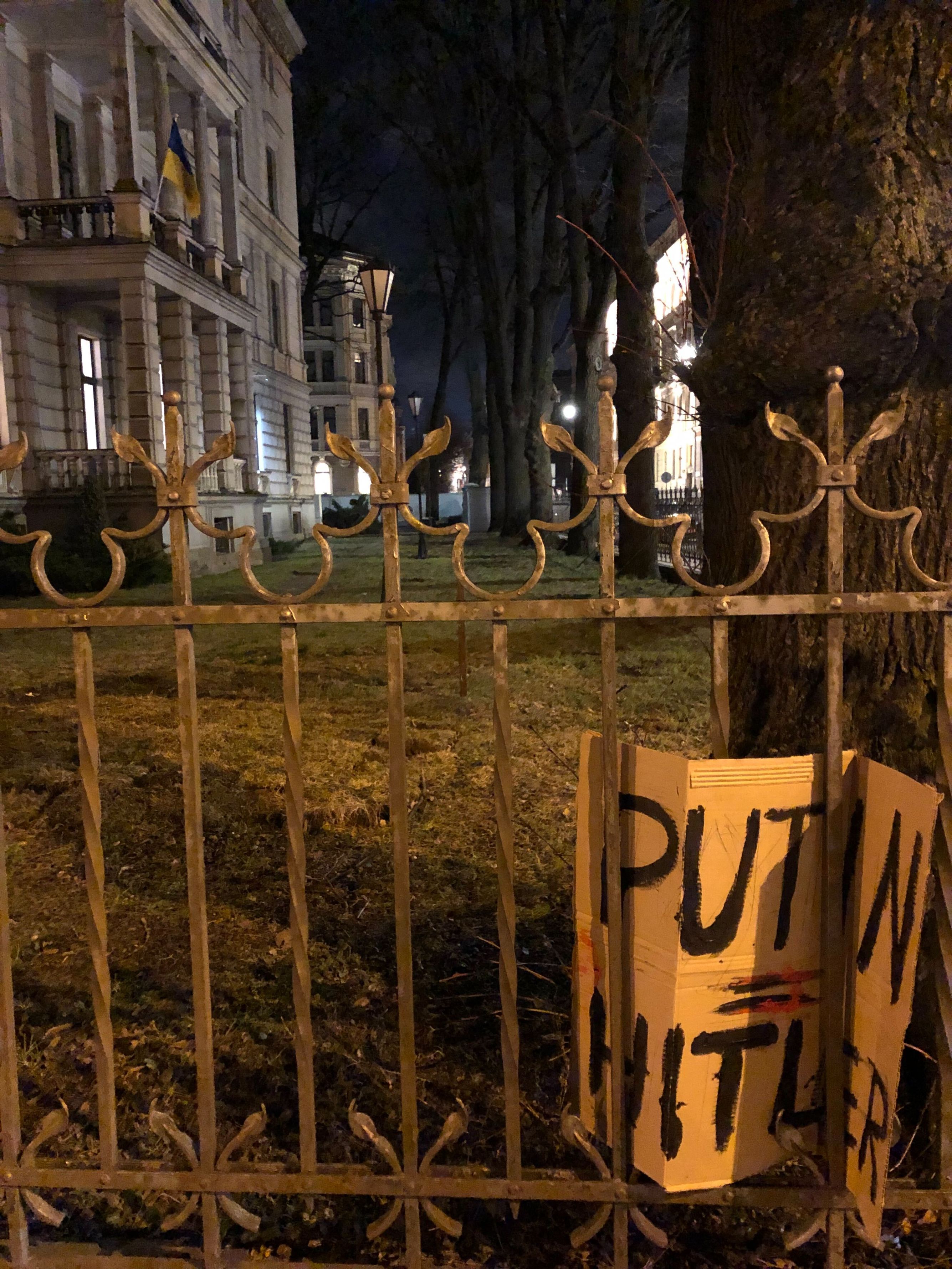 В Риге, как и в других городах мира, проходит многочисленная акция протеста возле посольства РФ. Внимание: на опубликованных кадрах могут быть нецензурные выражения.