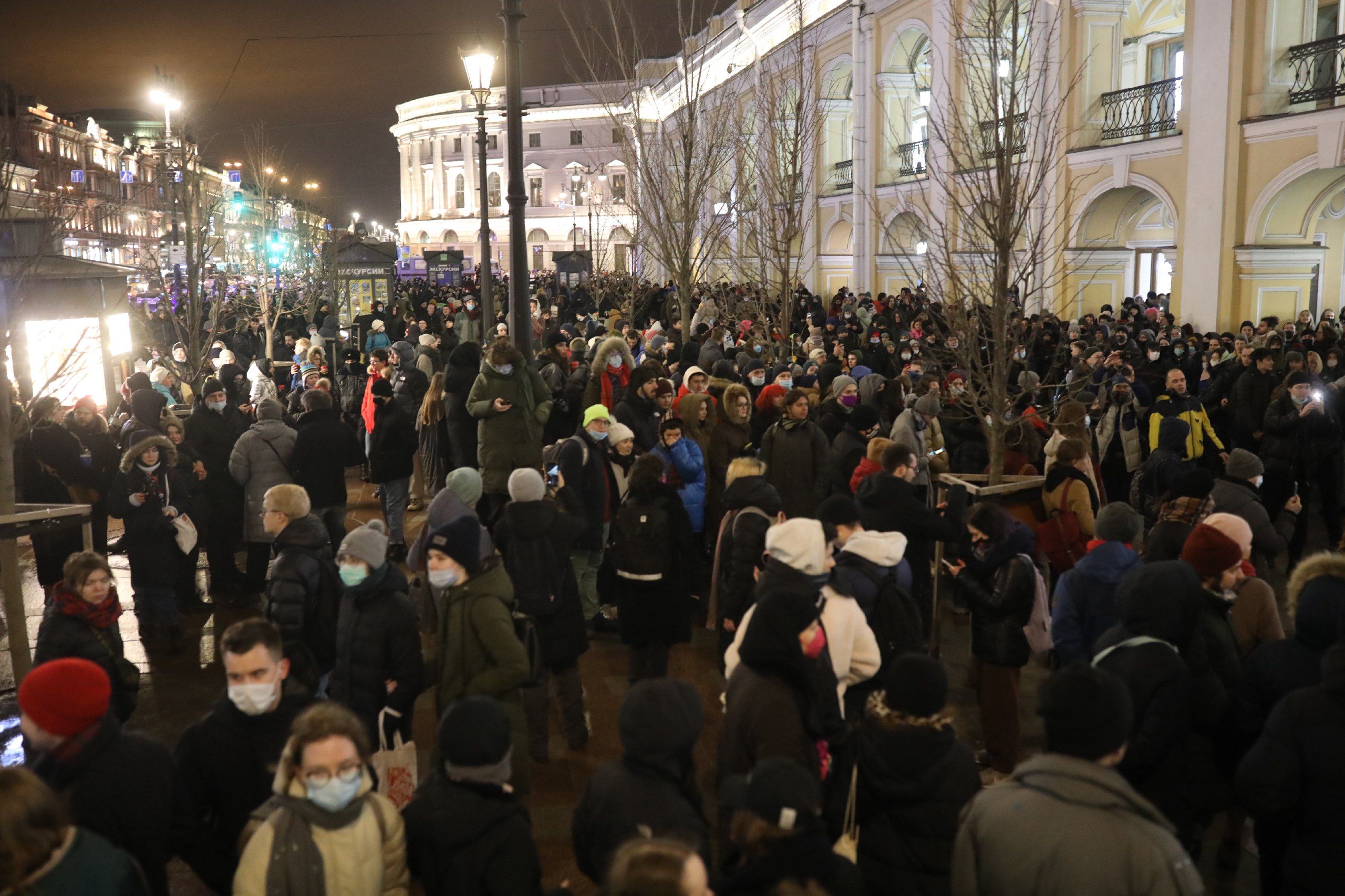 В Петербурге у Гостиного двора, где проходит акция против войны с Украиной, собрались несколько сотен человек. Посмотрите, как это выглядит. По оценке правозащитников, в Петербурге задержаны более 180 человек.