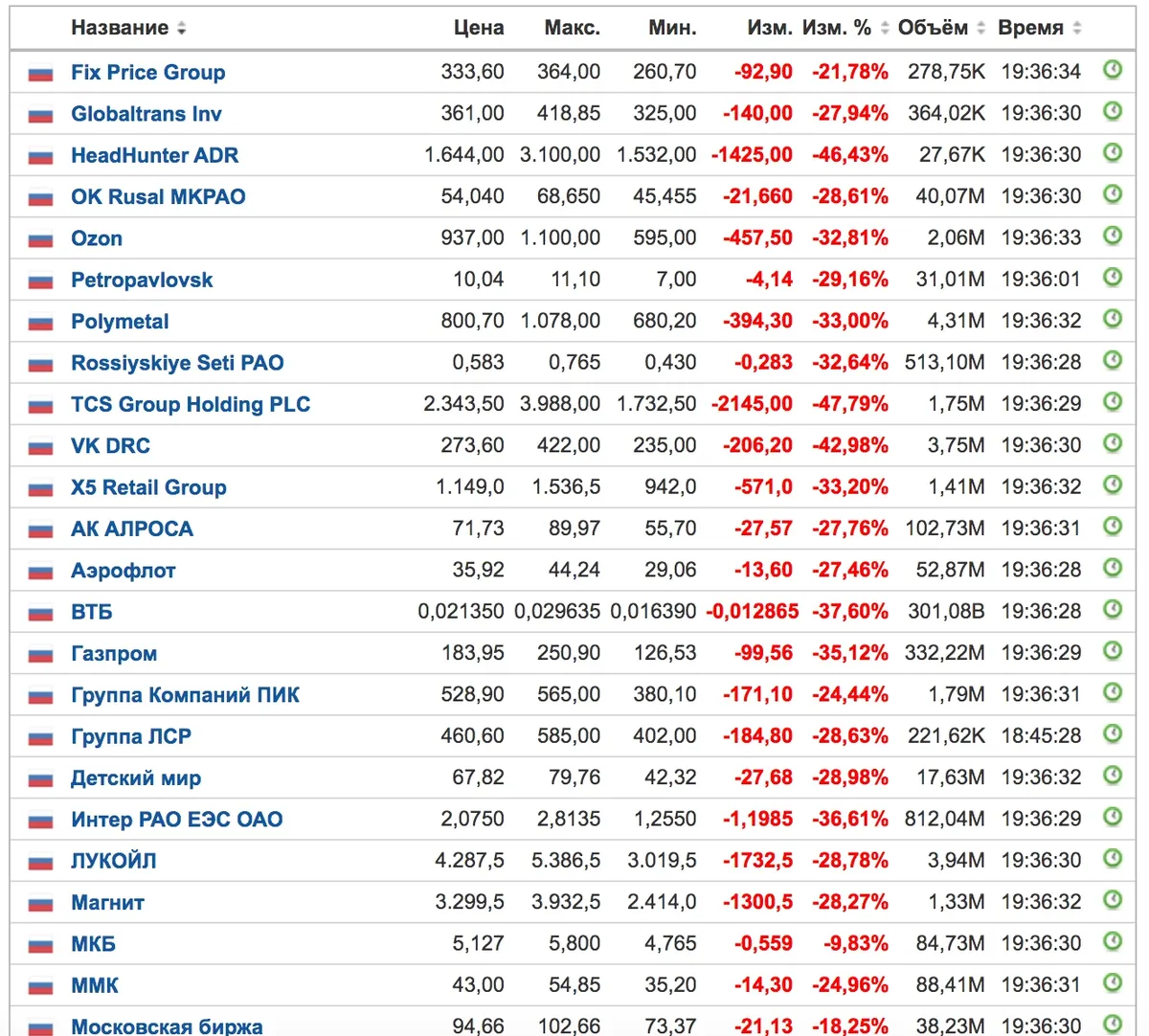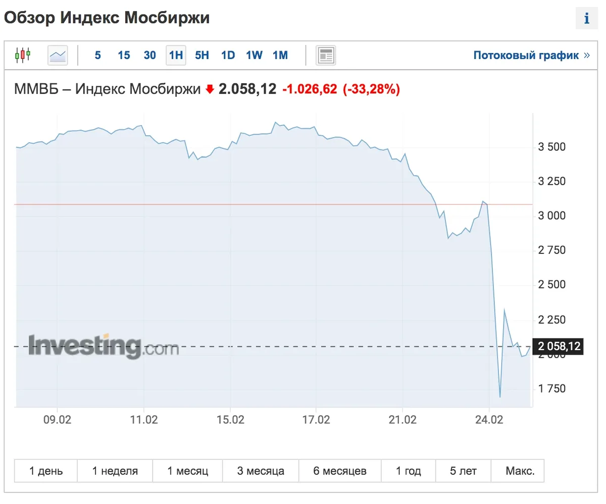По итогам торгов индекс Мосбиржи составил 2058,12 пункта (-33,3%), индекс РТС — 742,91 пункта (-39,4%). Обвалились акции следующих российских компаний — «Ozon» (-32,81%), ВТБ (-37,6%), «Газпром» (-35,12%), «Аэрофлот» (-27,46%), «Лукойл» (-28,78%).