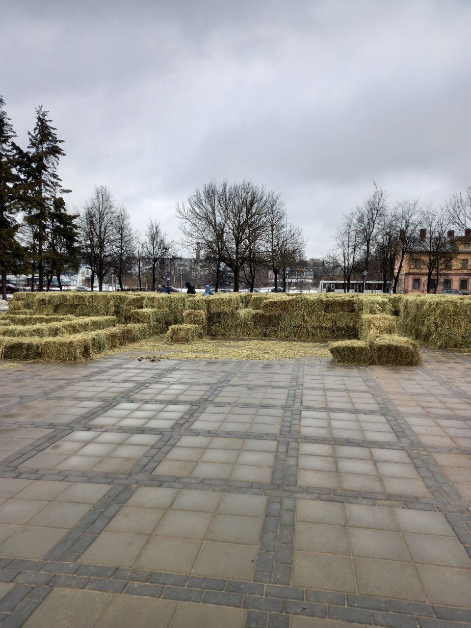 В сквере на Четырёх углах, судя по всему, уже начинаются приготовления к празднованию, завезено сено, которое послужит декорацией.