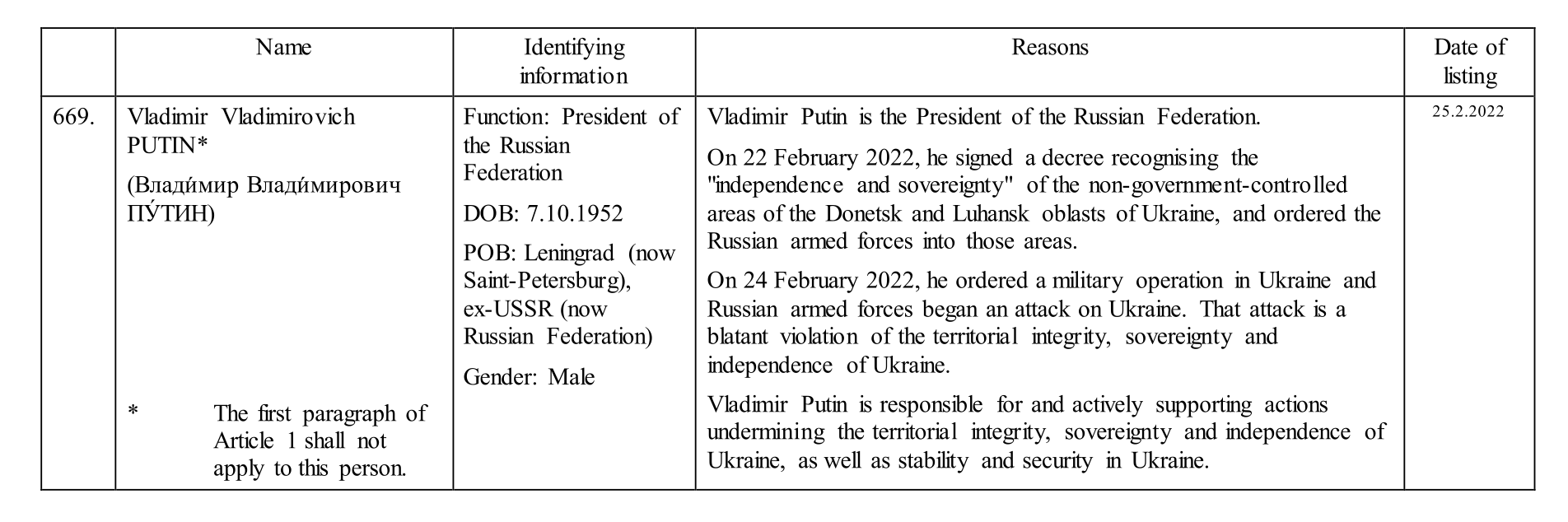 Вот так выглядит карточка Владимира Путина в санкционном списке ЕС