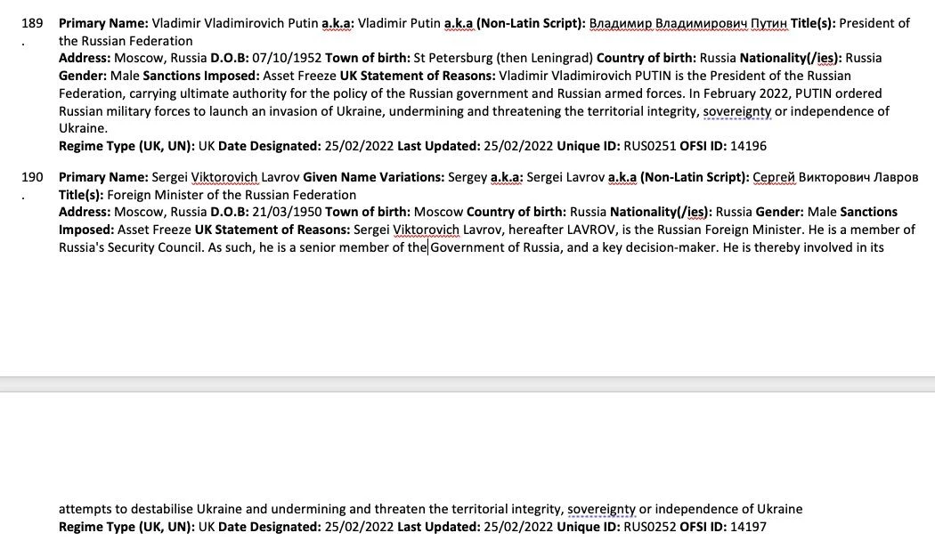 Великобритания ввела санкции против Путина и Лаврова против президента Владимира Путина и министра иностранных дел России Сергея Лаврова из-за военной «спецоперации» в Украине. Об этом говорится в документе, размещенном на сайте британского правительства.