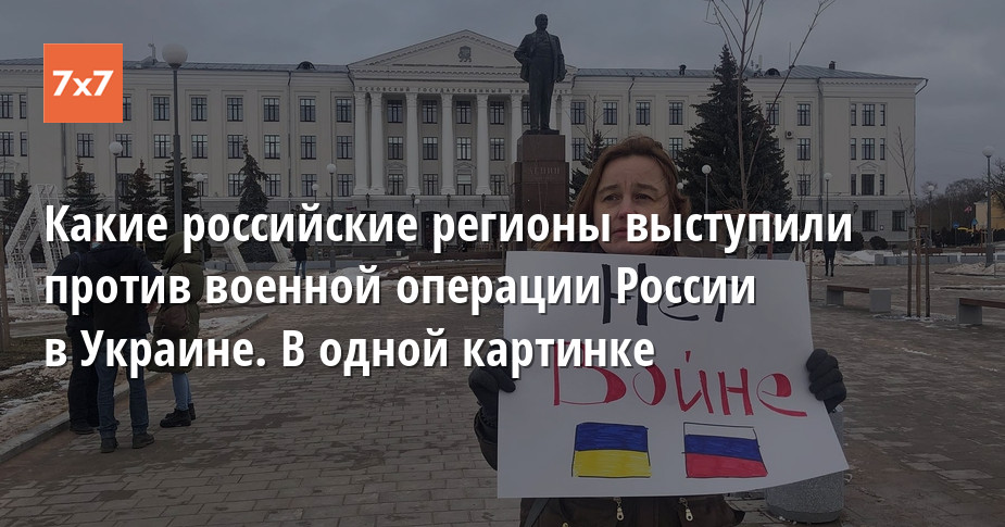 Владимир Путин утром 24 февраля объявил о начале «специальной военной операции» на Украине. В этот же день в России прошли акции против войны, на которых, по данным проекта «ОВД-Инфо»*, задержали не меньше 1,8 тыс. человек. Какие регионы потребовали прекратить военные действия на Украине — в одной картинке «7х7».