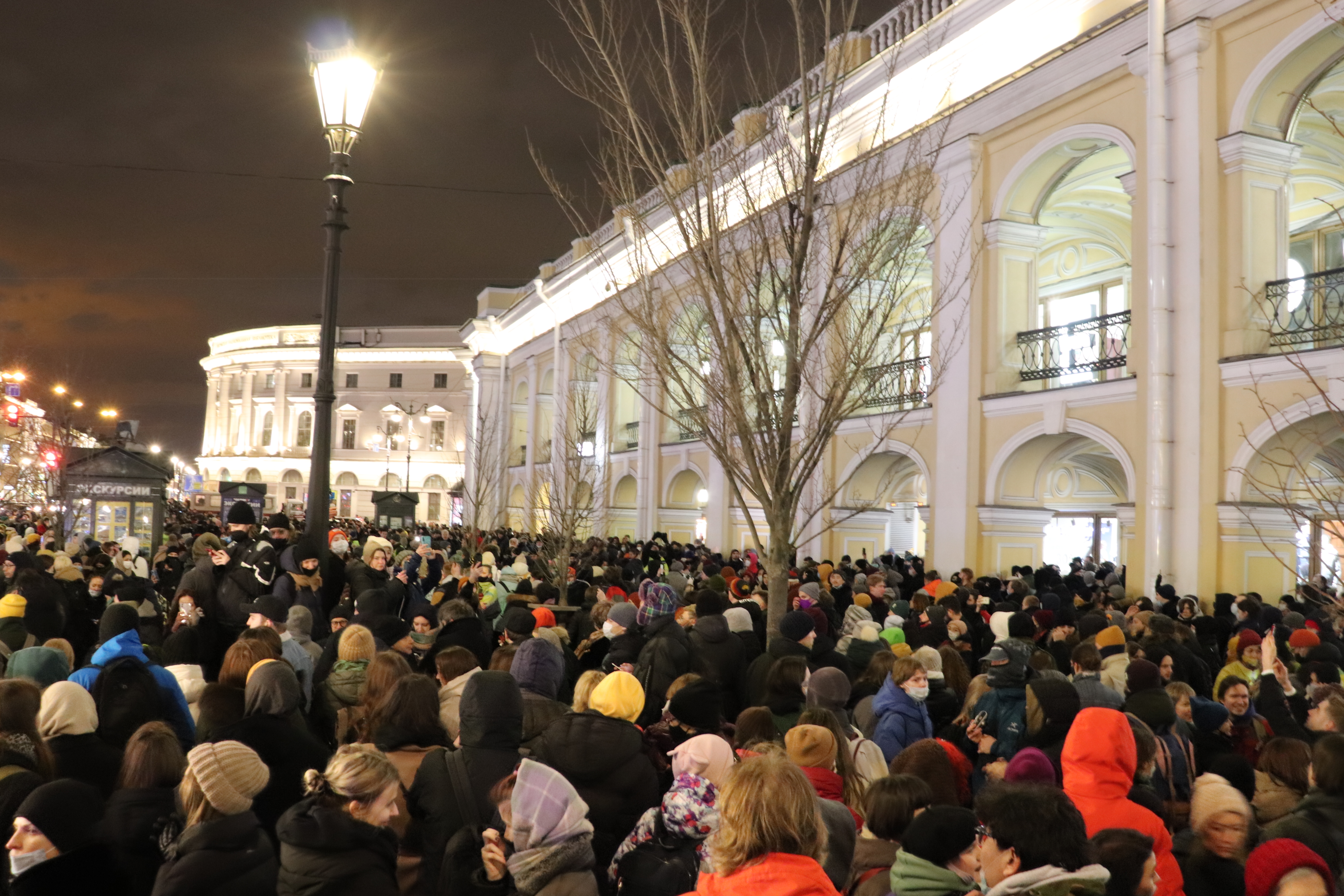 Собравшаяся толпа растянулась вдоль всего Гостиного двора ближе к 20:00. Люди стояли на лестнице башни Городской думы, десятки протестующих оказались на другой стороне Невского проспекта и кричали антивоенные лозунги. Моментально на другой части Невского проспекта появилось оцепление из сотрудников полиции и Росгвардии.