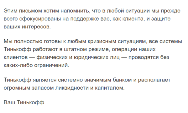 В то же время стали появляться сообщения, что Сбербанк недоступен за границей. Помимо него, недоступен оказался и Тинькофф банк, а в банкоматах последнего в России закончилась валюта. Клиенты Тинькофф банка жаловались, что в онлайн-приложении кредитной организации не работает конвертация рублей в доллары — платформа выдает ошибку «Сервис временно недоступен». Однако позднее в банке заявили, что все системы работают в штатном режиме, а операции физических и юридических лиц проходят без ограничений.
