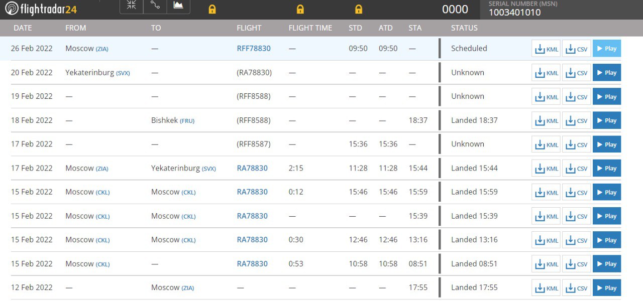 Согласно данным Flight Radar, 20 февраля этот самолет был замечен в аэропорту Екатеринбурга.