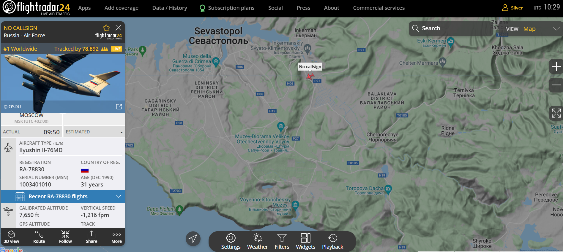Российский военный десантный самолет ИЛ-76, который 26 февраля около 9 утра по киевскому времени вылетел из аэропорта «Жуковский» из Москвы, в 12:33 (также по киевскому времени) зашел на посадку в аэропорту Севастополя «Бельбек в аннексированном Крыму. Об этом свидетельствуют данные сайта мониторинга воздушных судов Flight Radar.