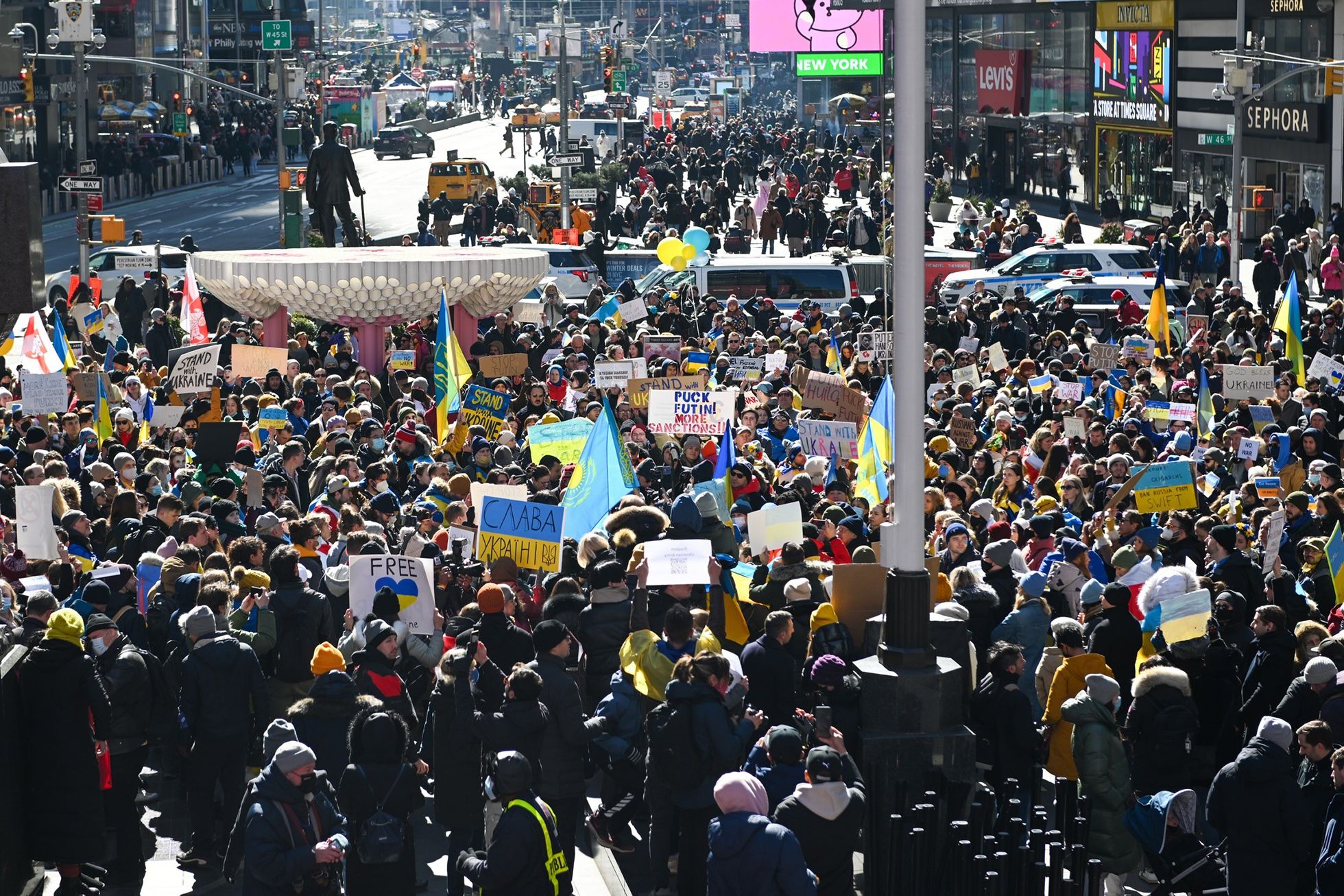 По всему миру продолжаются массовые акции против войны в Украине. Люди выходят на улицы с украинскими флагами и плакатами «Мир», «Свободу Украине», «Остановите войну», «Остановите Путина», «Путин, убирайся». Публикуем фотографии с митингов в поддержку Украины, которые прошли 25 и 26 февраля.