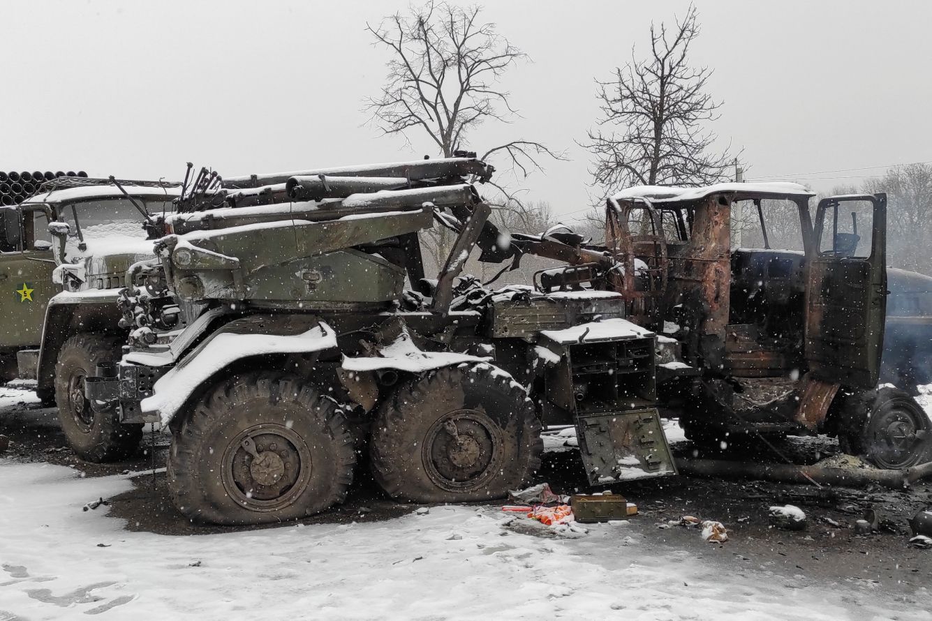 Maksim Levin / Reuters / Scanpix / LETA Поврежденные машины системы залпового огня в окрестностях Харькова. 25 февраля 2022 года