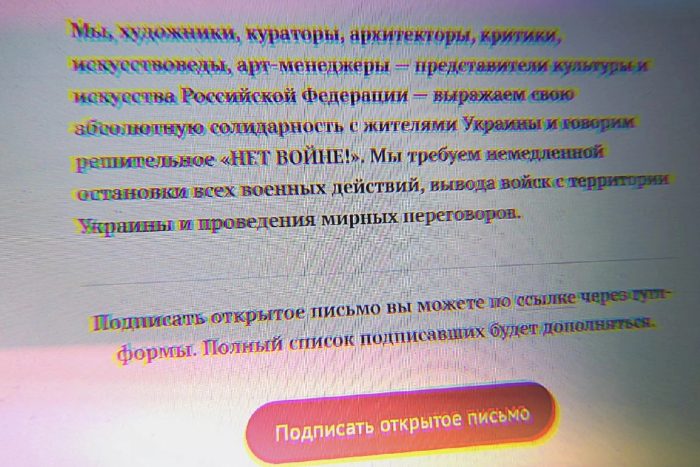 «Сейчас в первую очередь нас беспокоит судьба украинцев, их жизнь и безопасность! Однако от лица профессионального сообщества нам также важно сказать, что дальнейшая эскалация войны обернется непоправимыми последствиями для работников искусства и культуры. Это заберет у нас последние возможности полноценно работать, высказываться, создавать проекты, популяризировать и развивать культуру, отнимет будущее.
