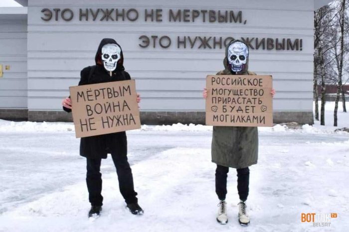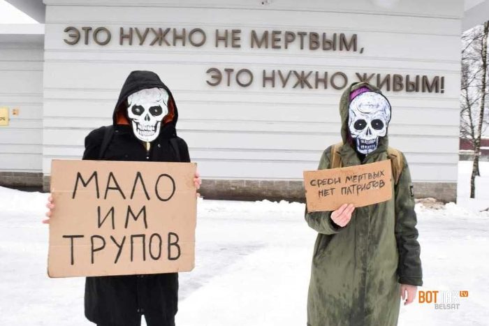 Активисты встали под надписью «Это нужно не мертвым, это нужно живым» в масках скелетов с плакатами «Мало им трупов» и «Среди мертвых нет патриотов». Помимо этого, есть фотографии с плакатами «Мертвым война не нужна» и «Российское могущество прирастать будет могилками».