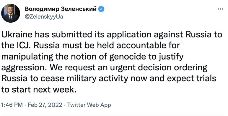 Он написал, что «Россия должна быть привлечена к ответственности за манипулирование понятием геноцида для оправдания агрессии». «Мы просим принять срочное решение, предписывающее России прекратить военные действий прямо сейчас, и ожидаем, что судебный процесс начнётся на следующей неделе», - написал Зеленский.