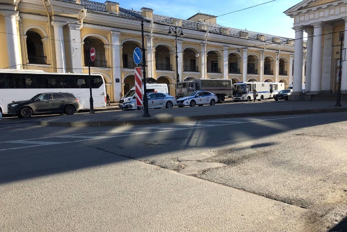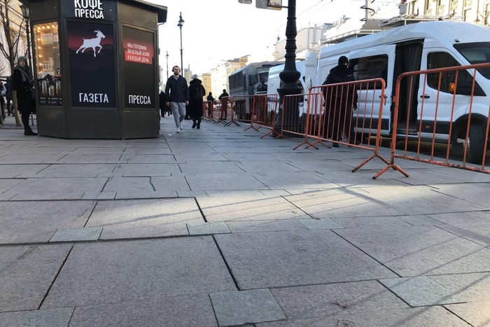 Корреспондент «Бумаги» видит заборы на Невском вдоль Гостиного двора. На Думской и Невском находится несколько автозаков, в общей сложности не больше десяти на момент публикации.