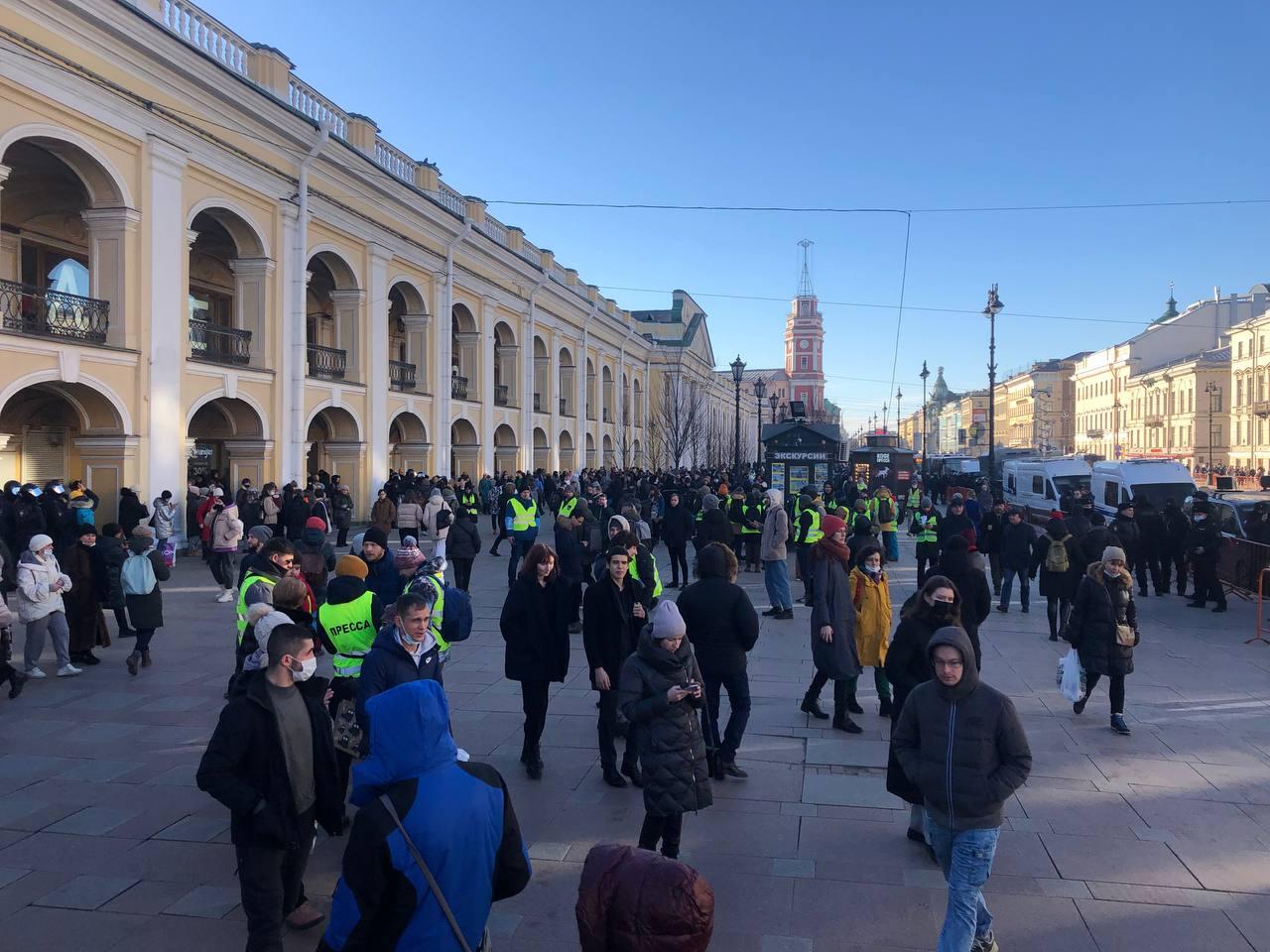 Перед станцией метро «Гостиный двор» — журналисты, а также около 70–80 человек. Там же прошло первое задержание — силовики увели девушку, которая развернула плакат.