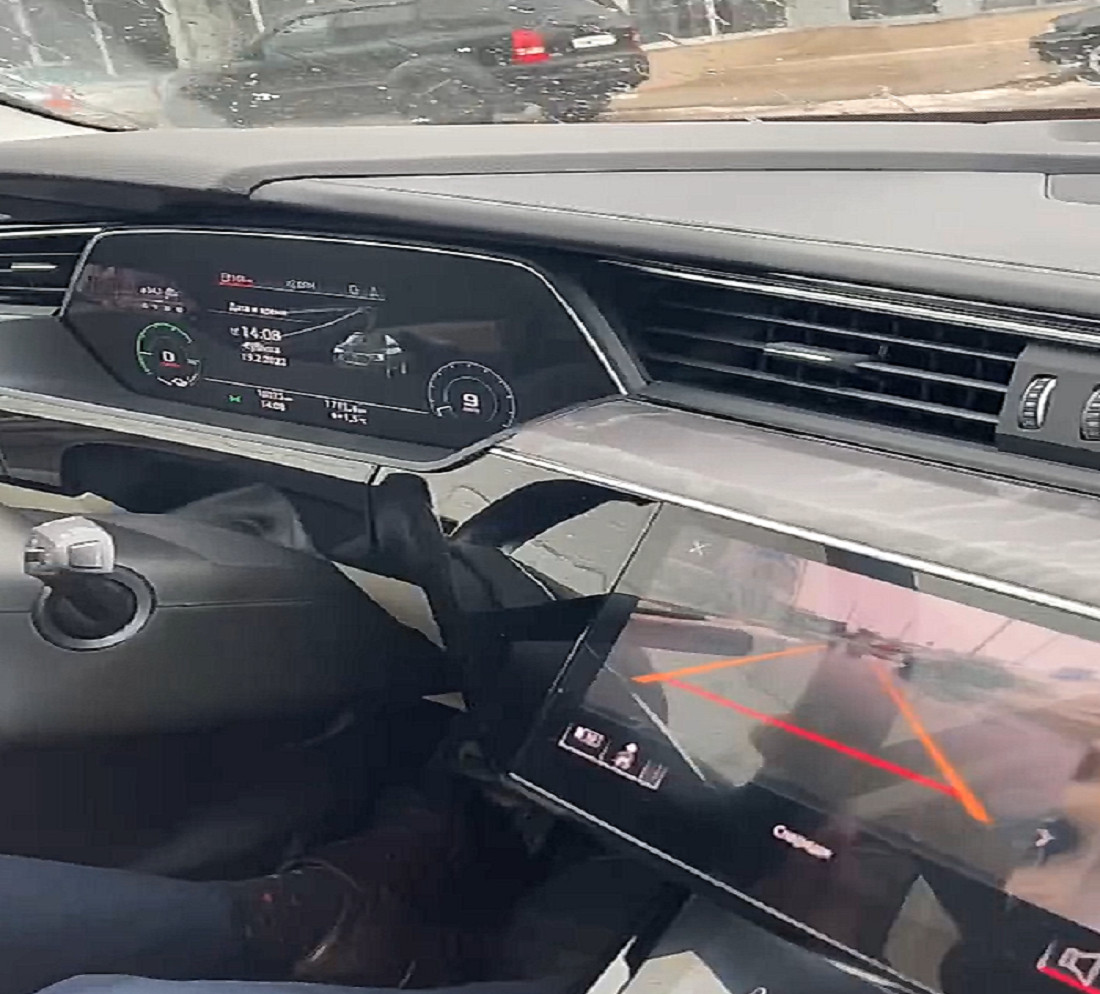 По бокам внутри кабины встроены видеокамеры, которые передают картинку в салон на большой и яркий экран – фактически телевизор с картинкой высочайшего разрешения. Это вводит в ступор, если честно. Совершенно непривычно. Во время движения глазами невольно все равно ищешь классические боковые зеркала.