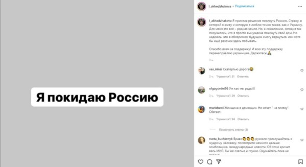 26 и 27 февраля СМИ и пользователи соцсетей распространили пост из инстаграм-аккаунта (@l_akhedzhakova), который якобы принадлежал Лии Ахеджаковой («Служебный роман», «Гараж», «Ирония судьбы, или с лёгким паром»). В публикациях говорилось, что актриса якобы пожертвовала на нужды украинской армии 10 тысяч долларов, а также собралась покинуть Россию.